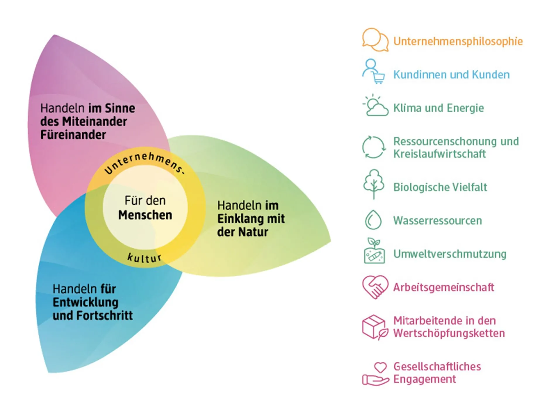 Auf Grundlage der doppelten Wesentlichkeitsanalyse wurden für die dm Gruppe zentrale Themen identifiziert und neu gruppiert. Einige Themen blieben erhalten, andere kamen aufgrund neuer regulatorischer Anforderungen hinzu. Diese Themen korrespondieren mit dem Windrad der Zukunftsfähigkeit und orientieren sich an den themenspezifischen ESRS-Standards. Sie bilden die Basis für Strategien, Ziele und Maßnahmen innerhalb unserer Wirtschaftsgemeinschaft.