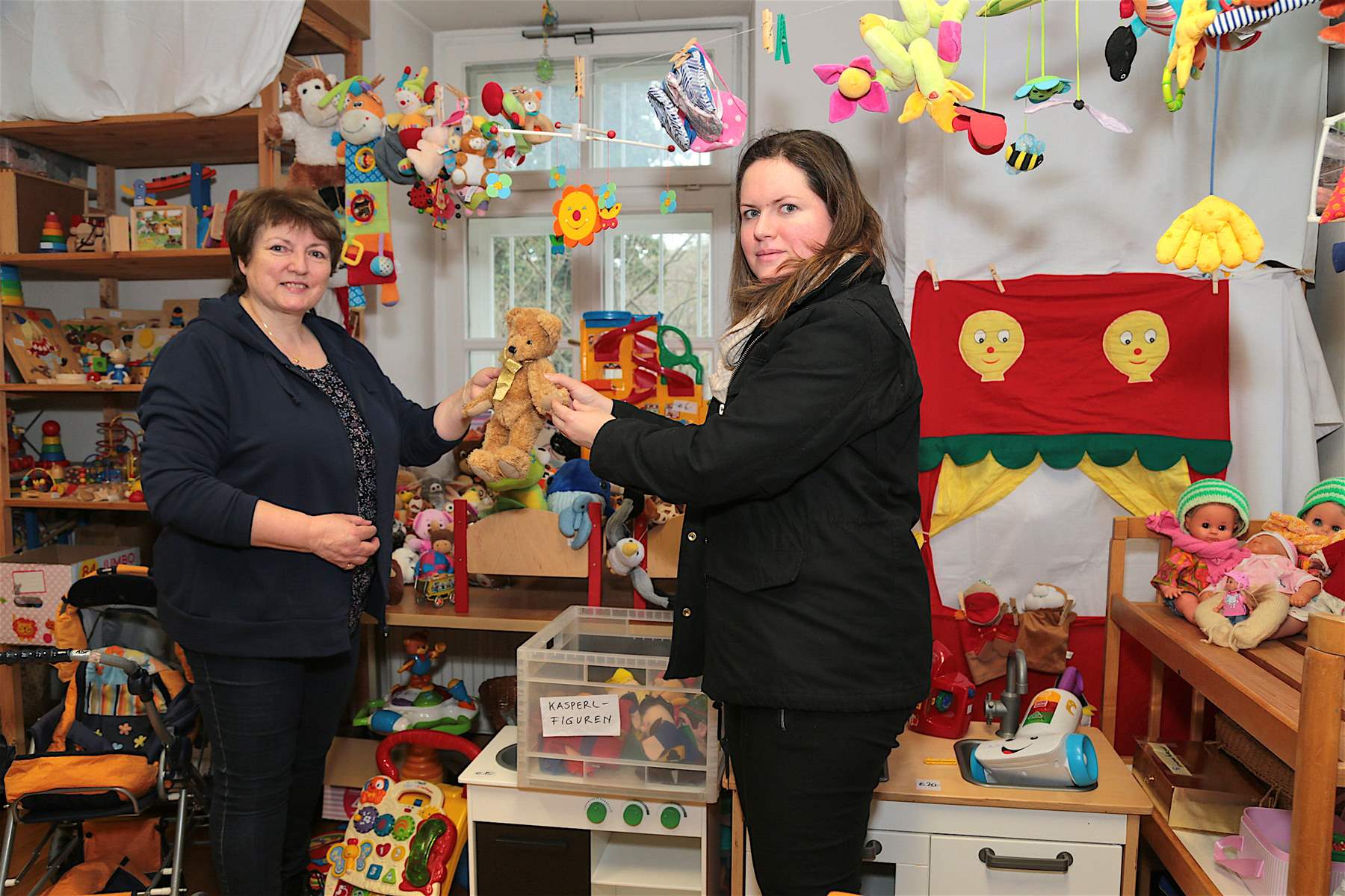 Mutter und Tochter im Einsatz für den guten Zweck: Gerti und Sandra Gaubinger beim Einsortieren von Spielzeug und Co.