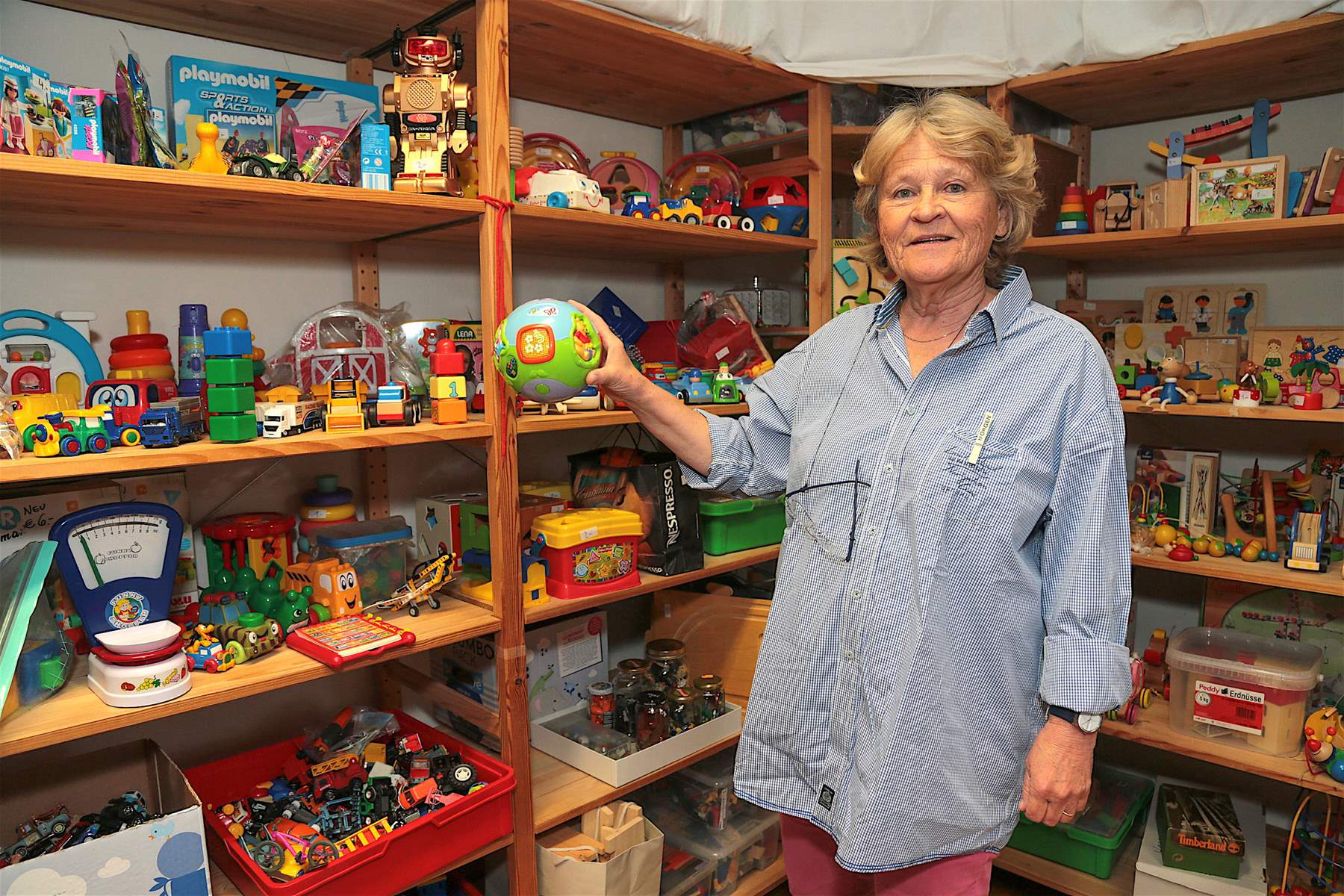 Renate Roittner, Geschäftsführerin von Aktion Leben Salzburg, vor dem gut sortierten Regal für Holzspielzeug.