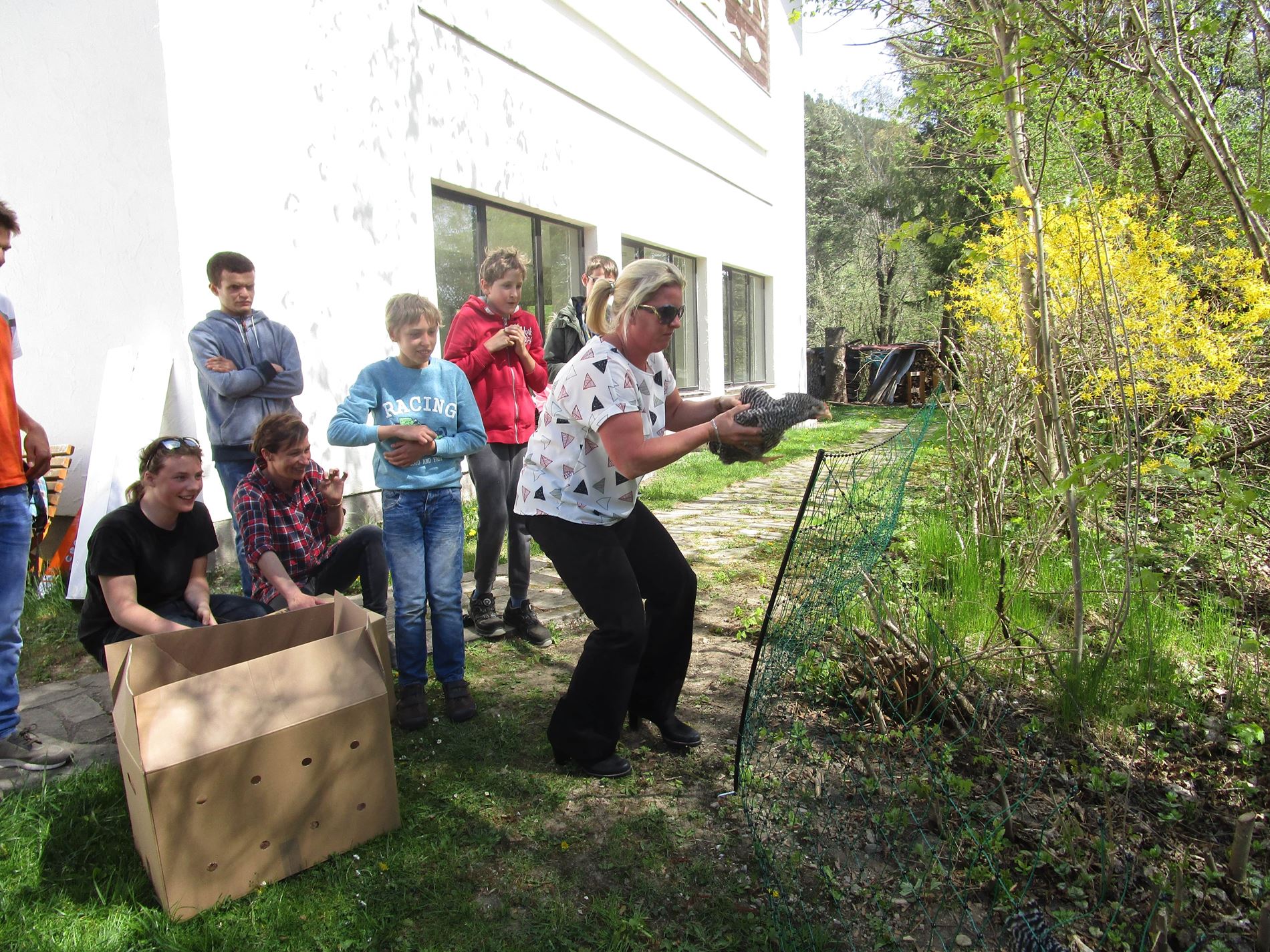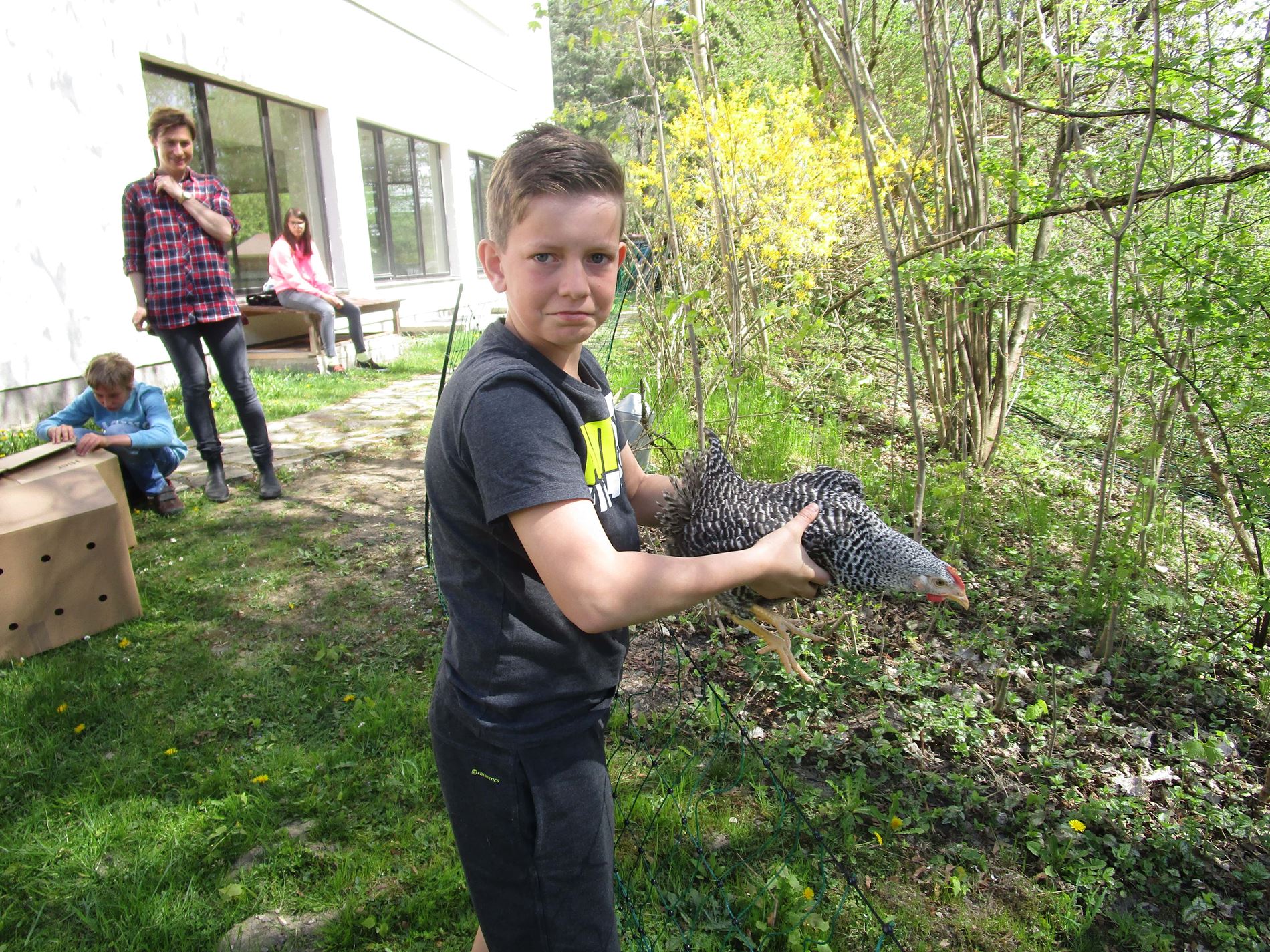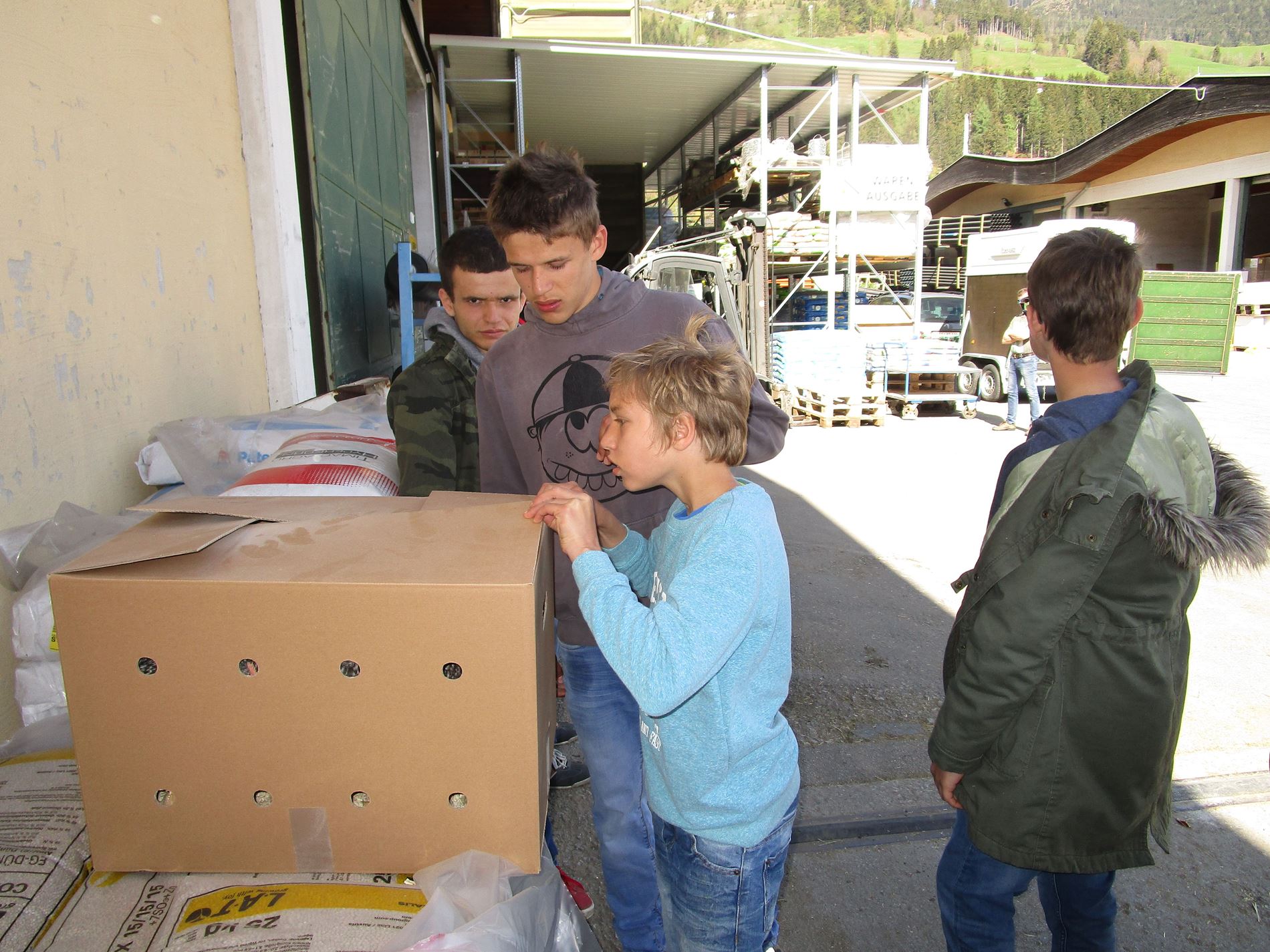 Ein paar Tage später ist es dann soweit. Die gefiederten Bewohner werden angeliefert. Neugierig werfen die Schüler und Schülerinnen einen ersten Blick auf die Hühner.