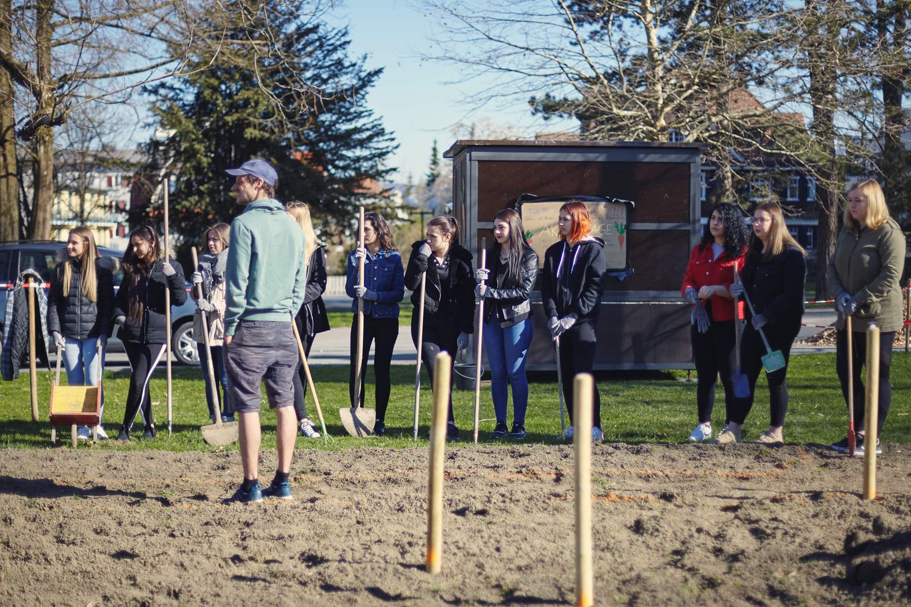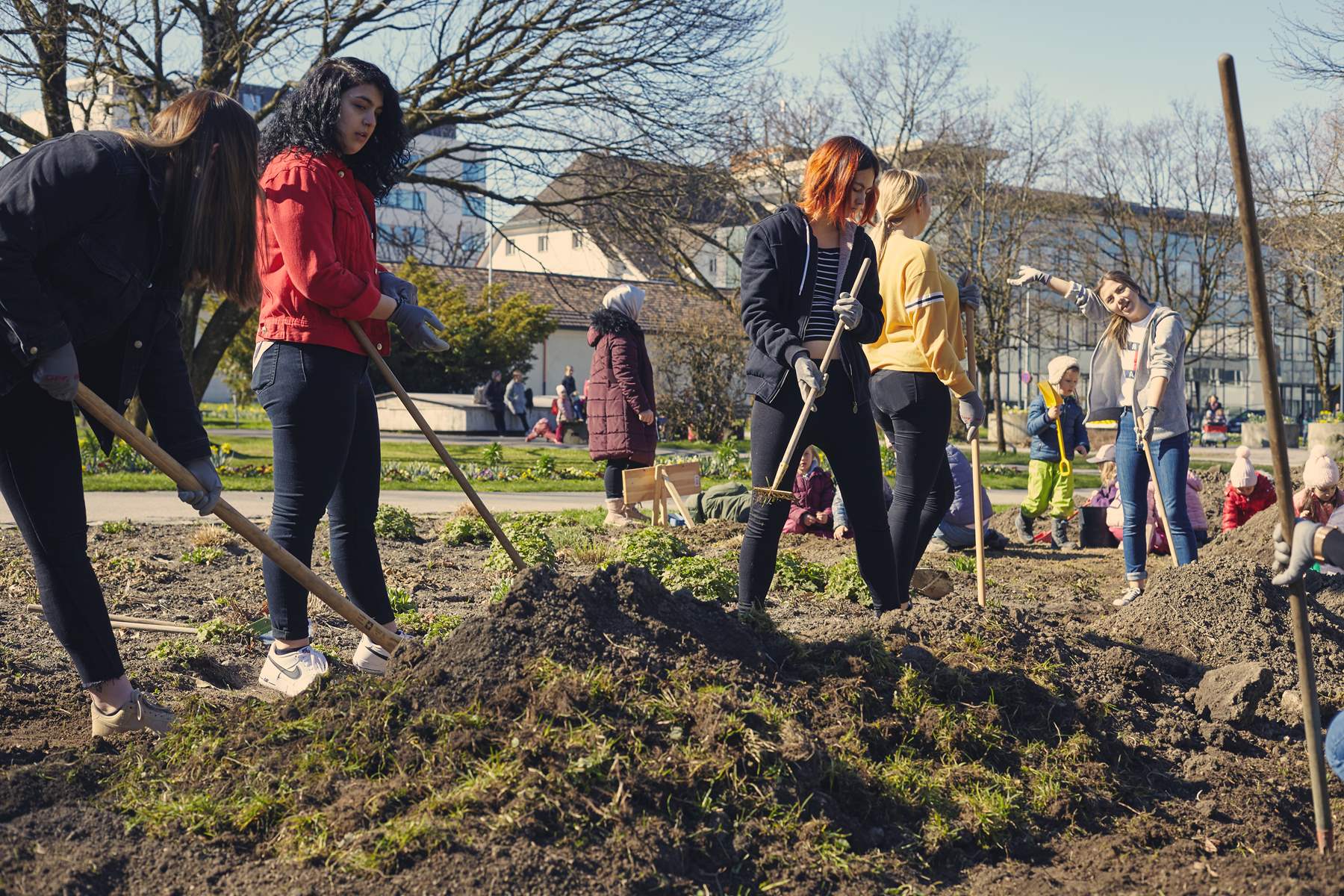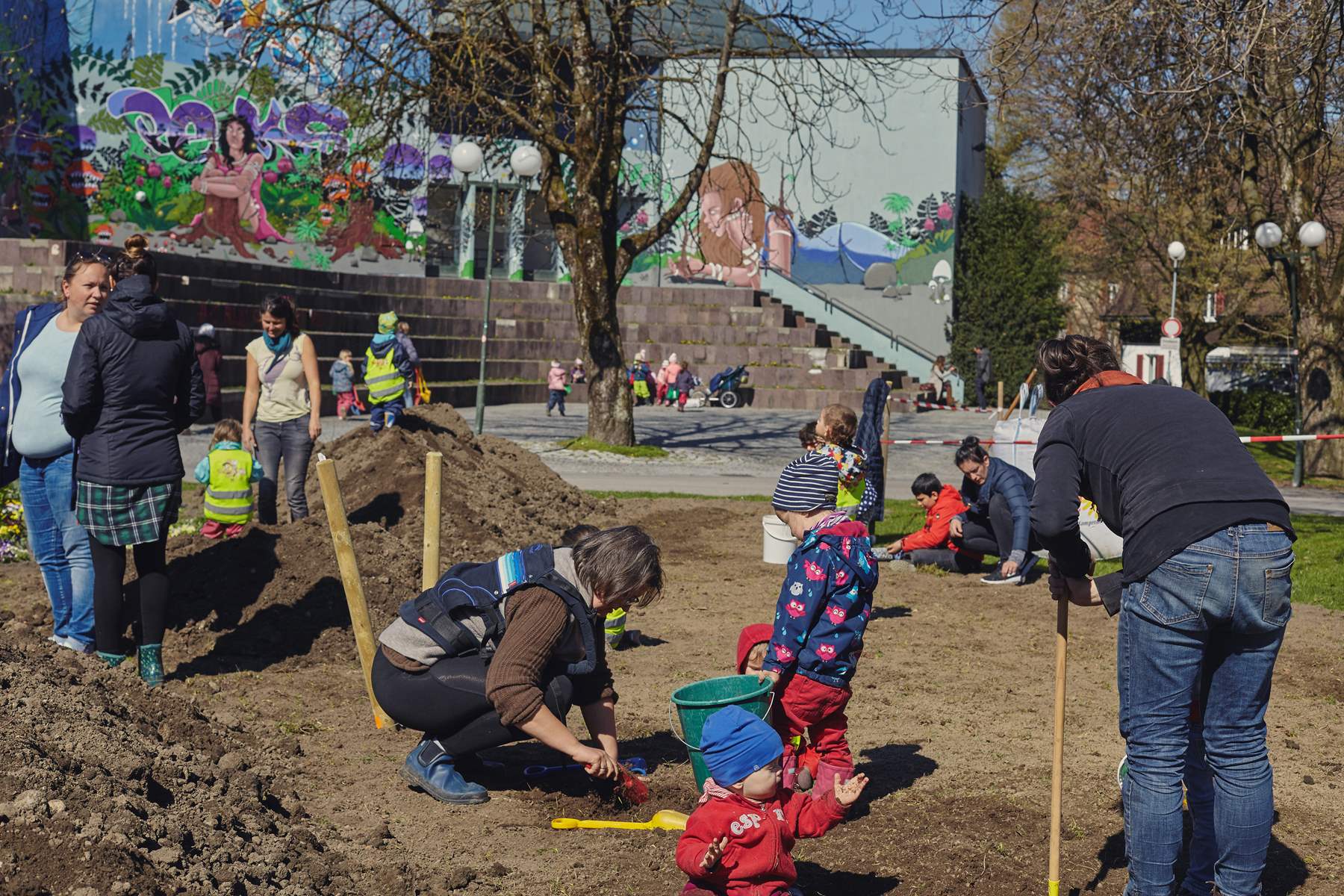 Viele kleine und große Hände packten am ersten Aktions-Wochenende Ende März fleißig mit an, um den Traum von der Essbaren Stadt Wirklichkeit werden zu lassen. Zahlreiche freiwillige Helfer befreiten den Boden von der Grasnarbe, legten die Beete und auch erste Wege an. Auf der Fläche sollen bald Gemüse, Beeren, Kräuter und Gewürze gedeihen. Bei strahlendem Sonnenschein fiel die Arbeit gleich viel leichter. Für die Stärkung der Gärtner war mit mitgebrachten Speisen für das Gemeinschaftspicknick.