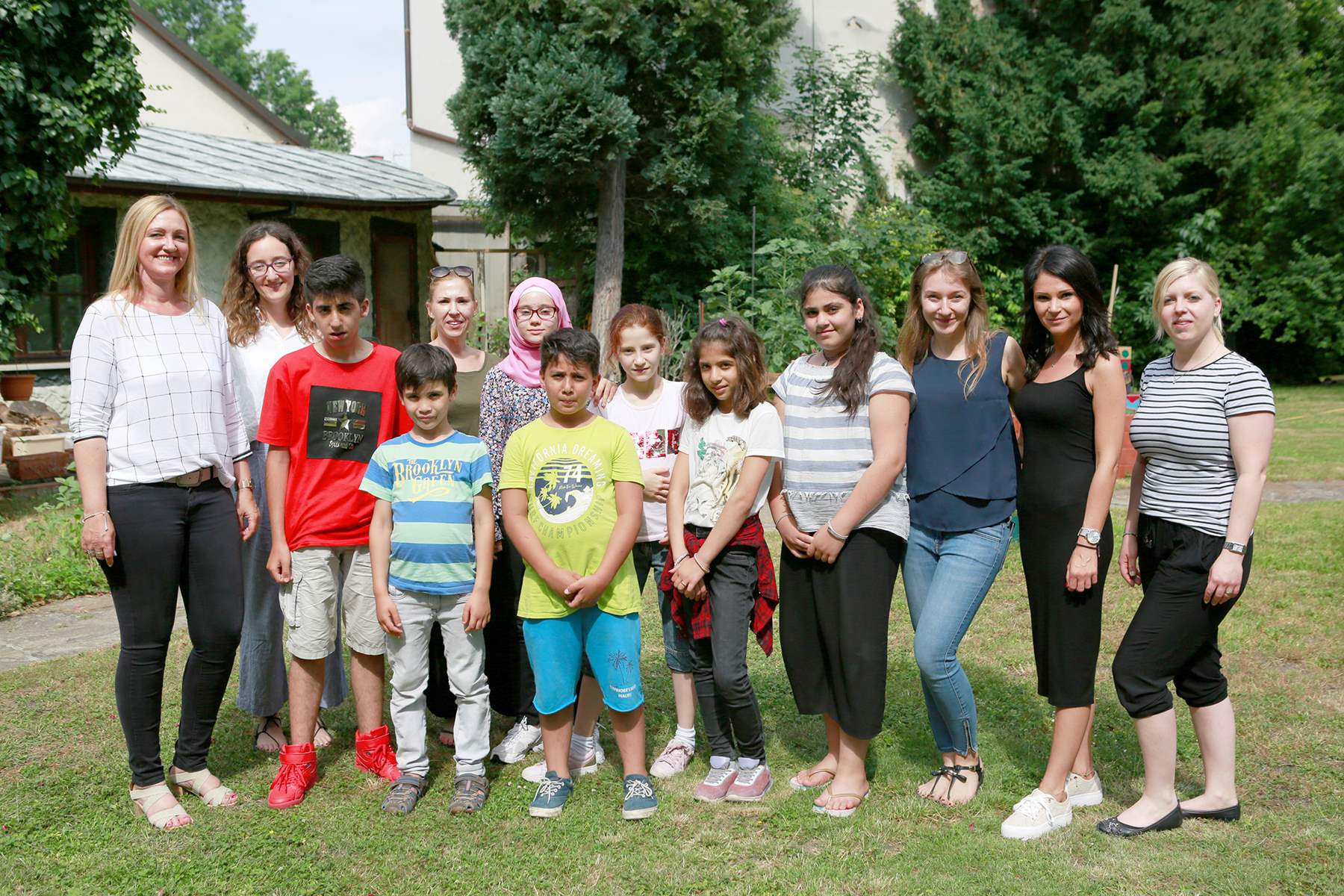 Die dm Mitarbeiterinnen Tanja Spuller und Natalie Tripam (hinten v.l.) mit den Lerncafé Kids.