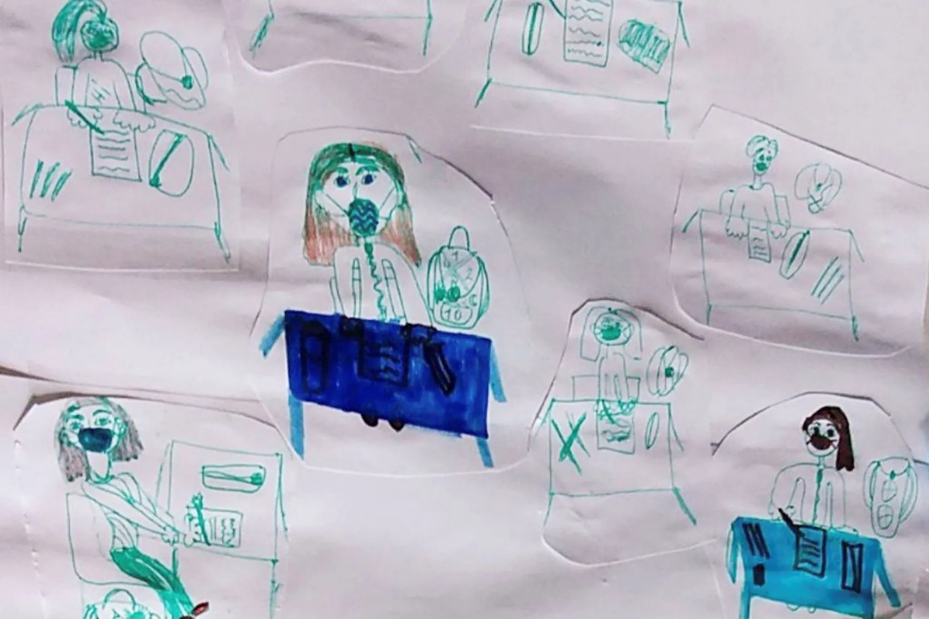 Ruth hat eine Zeichnung vom Lerncafé gemacht – an den Masken ist deutlich zu erkennen, dass Corona auch den Alltag im Lerncafé beeinflusst. Draußen kann hingegen nach Lust und Laune ohne Maske gemalt werden. Auf dem rechten Bild lassen sich Ruth und ihre Freundin Sham einen Muffin schmecken.