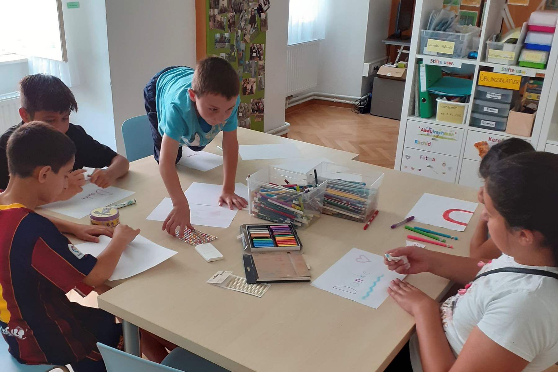 Neben der Gartenarbeit kommt jedoch auch der Spaß zu keinem Zeitpunkt zu kurz. Gerade an den heißen Tagen der zurückliegenden Wochen wurde daher im Garten der Rasensprenger aufgebaut, unter welchem sich die Mädchen und Jungen abkühlen konnten. Nach der Abkühlung ging es dann mit Ballspielen, Seifenblasen, Fangenspielen und anderen Aktivitäten weiter. Nach der anstrengenden und aufregenden Zeit im Garten hatten die Kinder noch die Möglichkeit in Ruhe zu malen. Hierbei wurden kreative und individuelle Dankeskarten für die dm Filialen erstellt, die das Lerncafé während des Projektzeitraums besonders unterstützen.