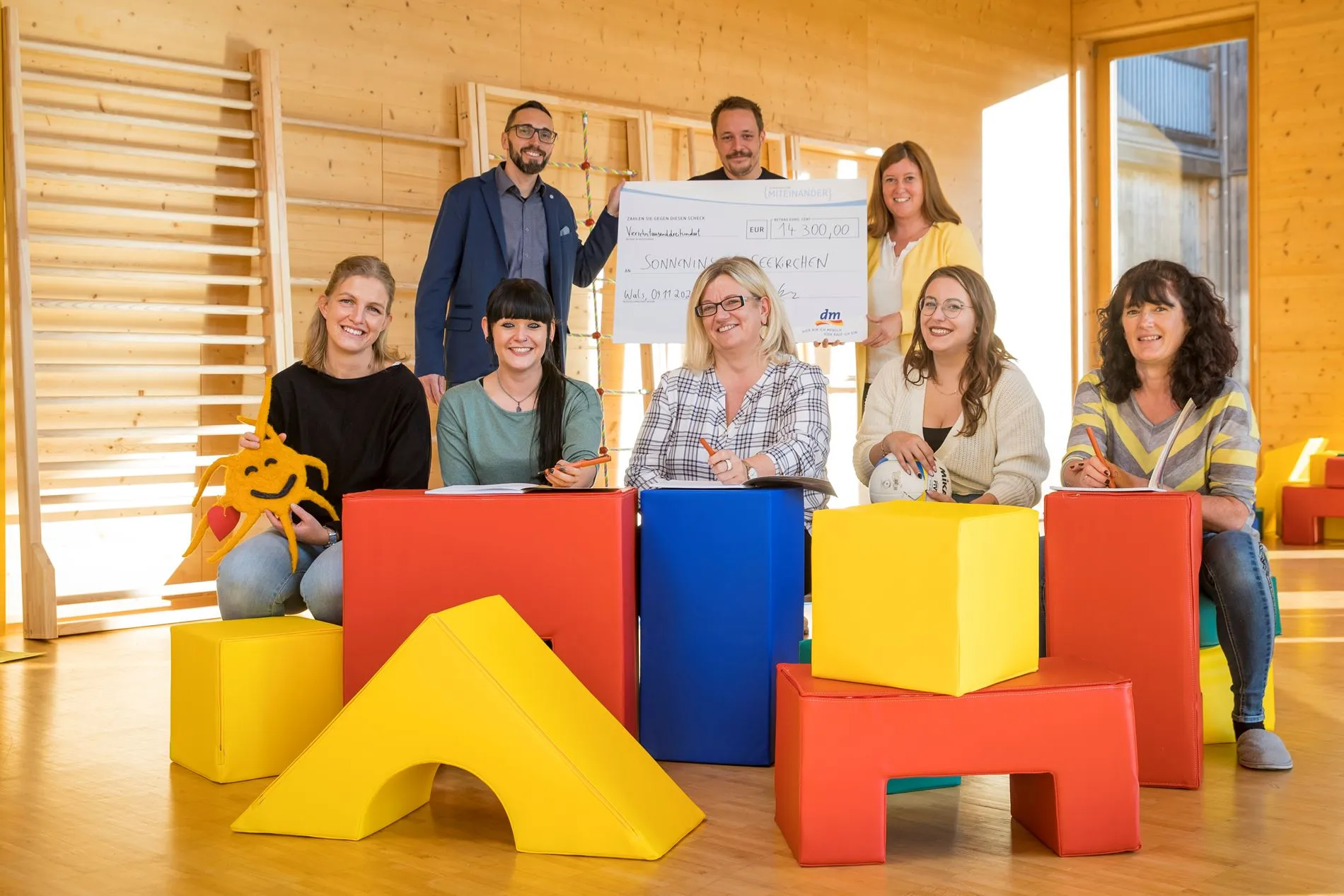 Zur Gestaltung des neuen Bewegungsraums in der Sonneninsel Seekirchen für mehr Mut, Stärke und Lebensfreude überreichte dm drogerie markt Anfang November feierlich einen Scheck in der Höhe von 14.300 Euro.