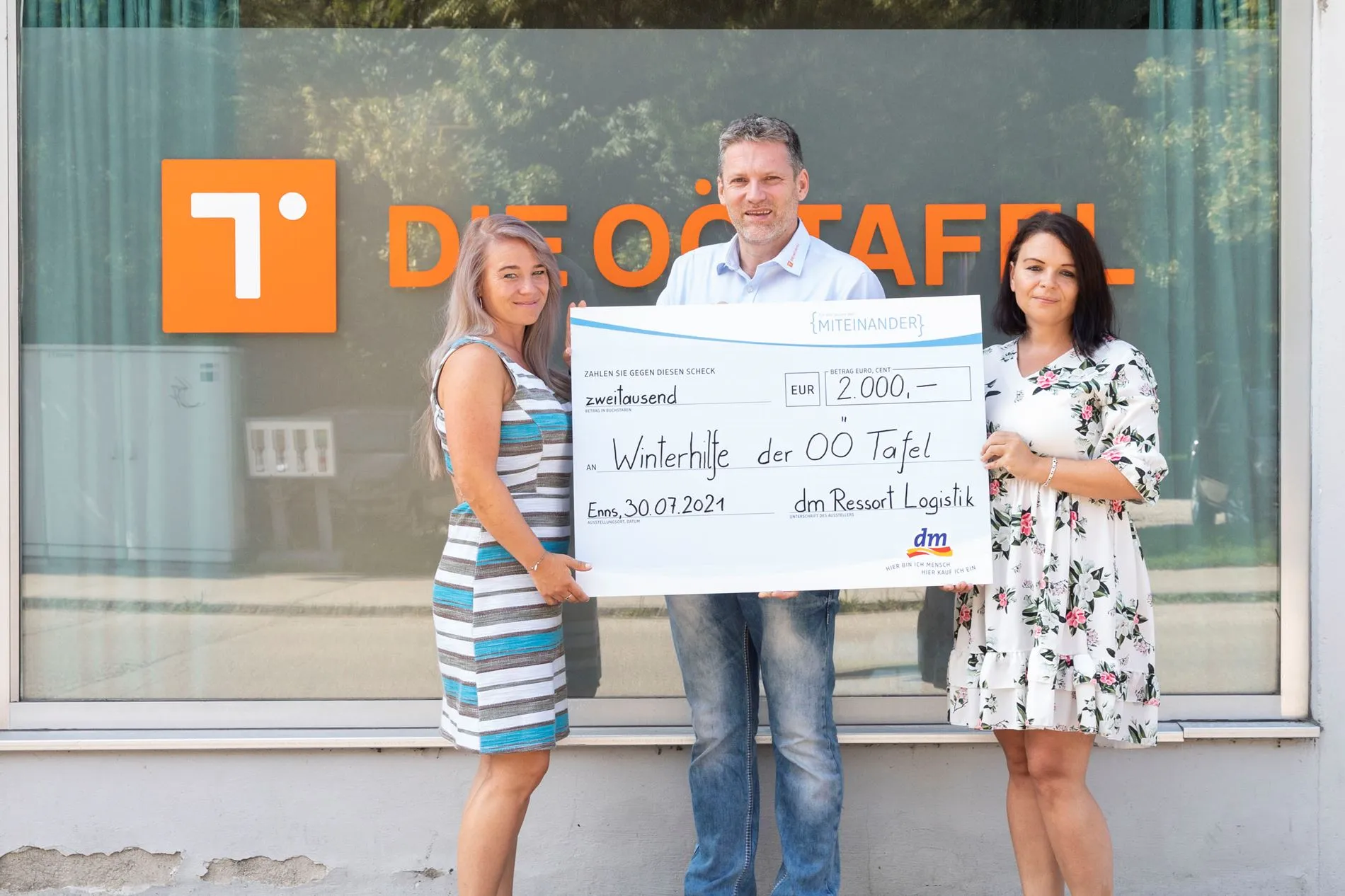 V.l.: Claudia Brandstetter (dm Logistik Enns), Erwin Hehenberger (Obmann OÖ Tafel), Andreea Tanase (dm Betriebsrätin)