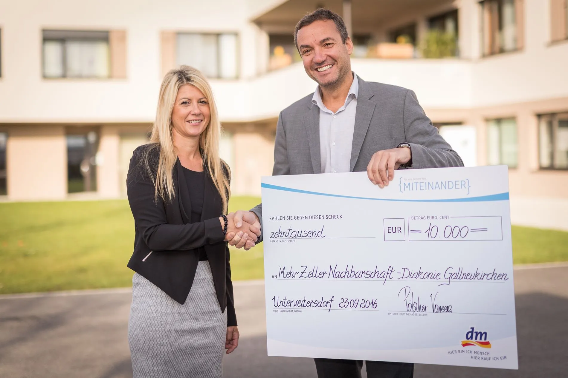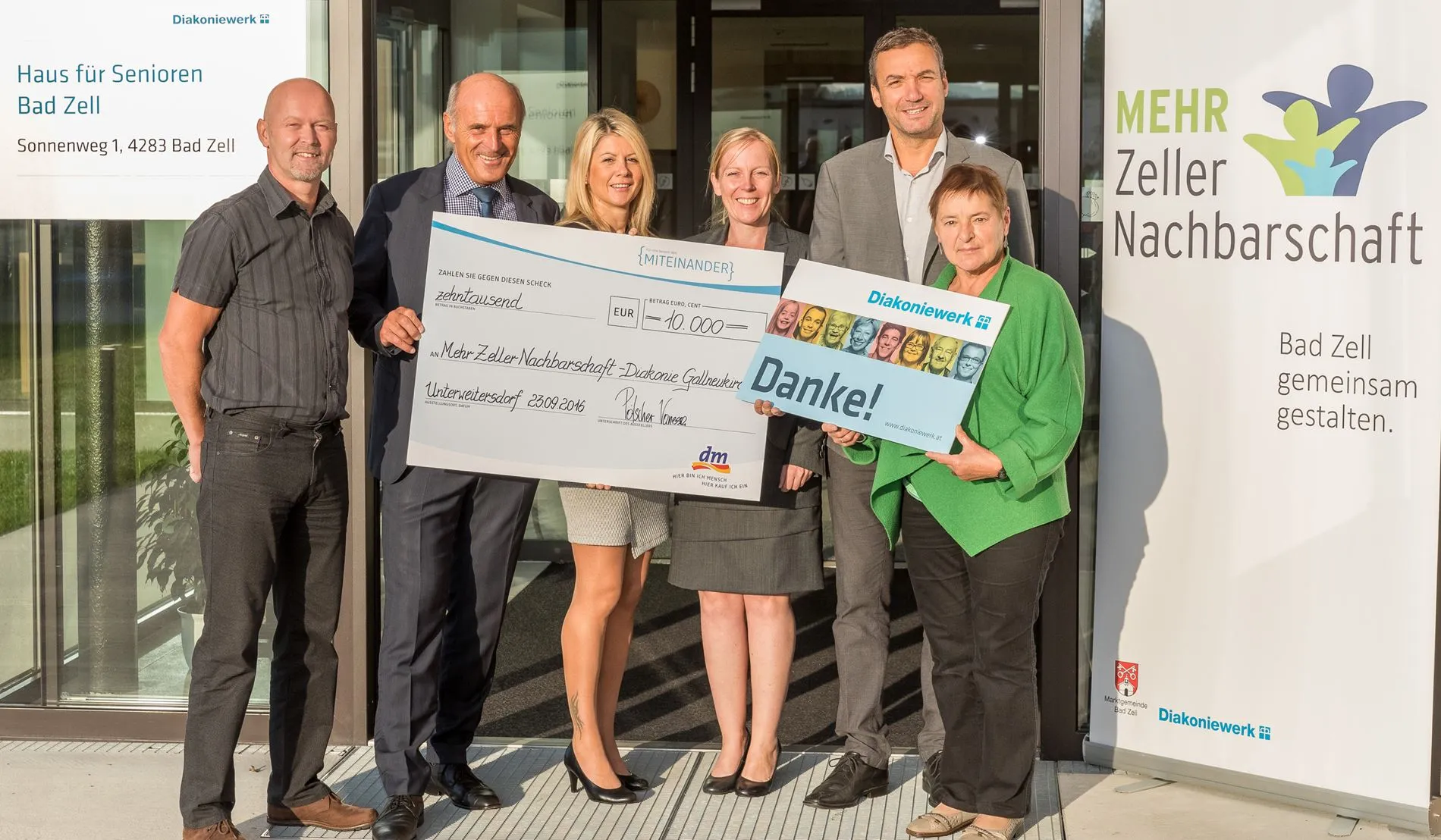 Um sozial benachteiligten Menschen ein Leben inmitten der Gesellschaft zu ermöglichen, rief das Diakoniewerk Gallneukirchen das Projekt „Mehr Zeller Nachbarschaft“ ins Leben. dm drogerie markt unterstützt dieses Projekt in vielfältiger Weise. Am Freitag 23. September 2016 überreichte dm Filialleiterin Vanessa Pötscher dem Diakoniewerk offiziell den Scheck in Höhe von 10.000 Euro. Die Kooperation von dm und dem Diakoniewerk Gallneukirchen findet im Rahmen der {miteinander}-Initiative statt, die dm zum 40-jährigen Unternehmensjubiläum ins Leben gerufen hat.