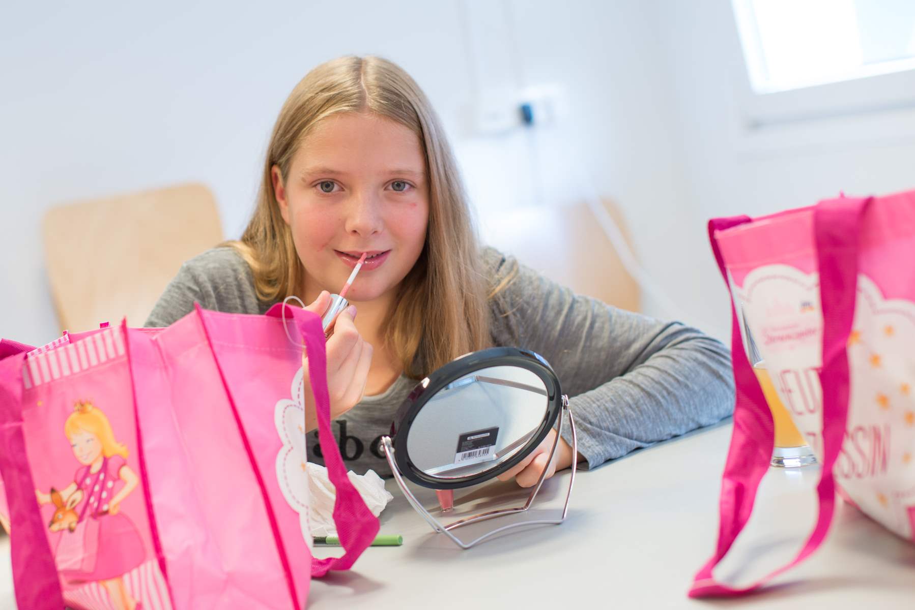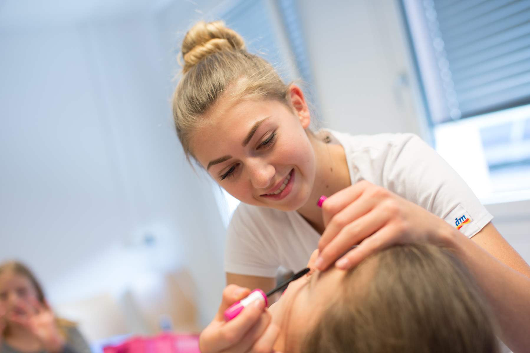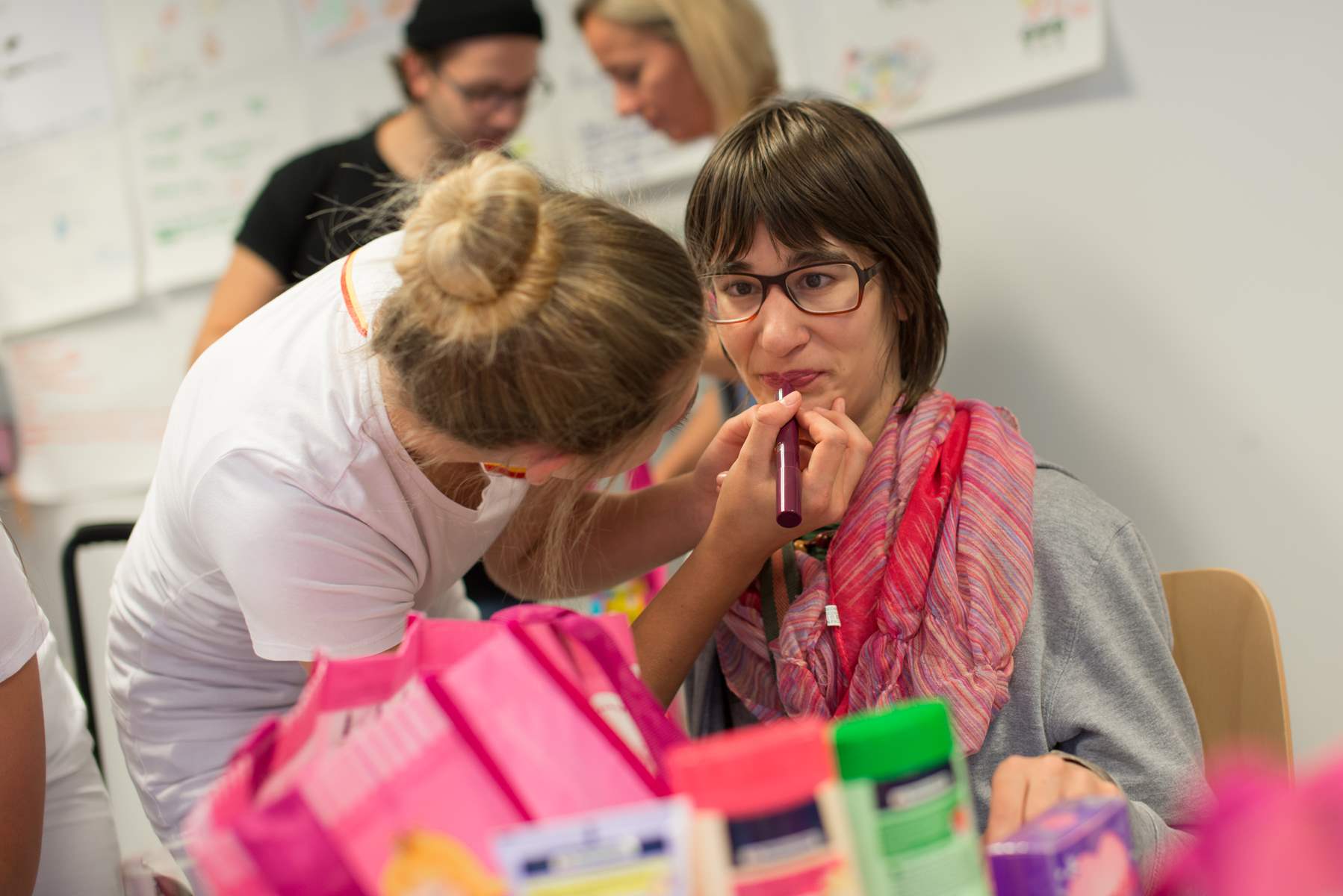 Nachdem jeder mit einer dm Tasche versorgt war, ging’s hinauf in den Aufenthaltsraum des Filialteams. Hier konnte die Gruppe in Ruhe die neuen Schätze aus den dm Taschen bewundern und sich bei den dm Schönheitsprofis Isabella (Kosmetikerin Filiale Universitätsplatz), Elisabeth (Stylistin Filiale Universitätsplatz) und Laura (dm Kosmetiklehrling Filiale Wals) ein perfektes Make-up und eine hübsche Frisur zaubern lassen. Die Begeisterung war riesig und am Ende konnte sich jeder über über seinen neuen Look für das Abendprogramm freuen.