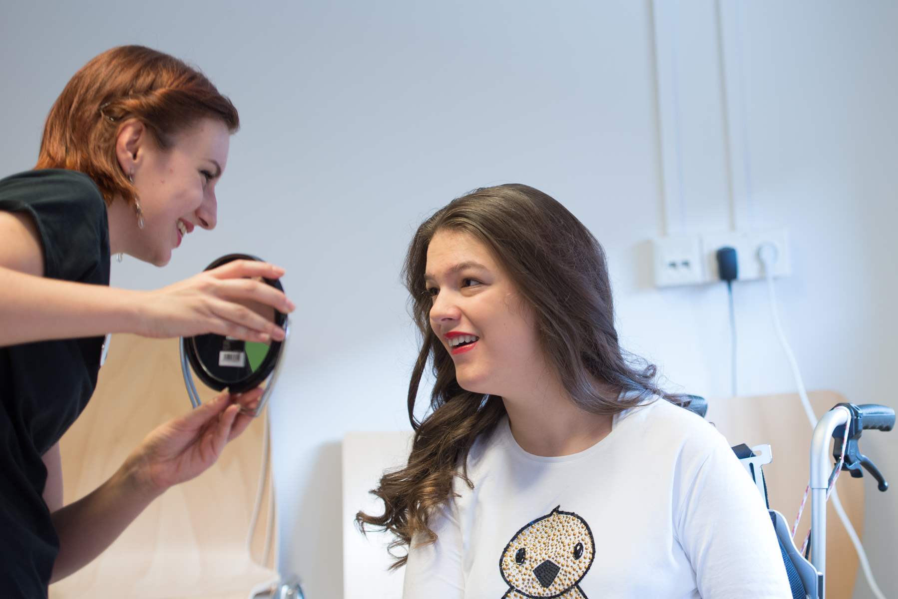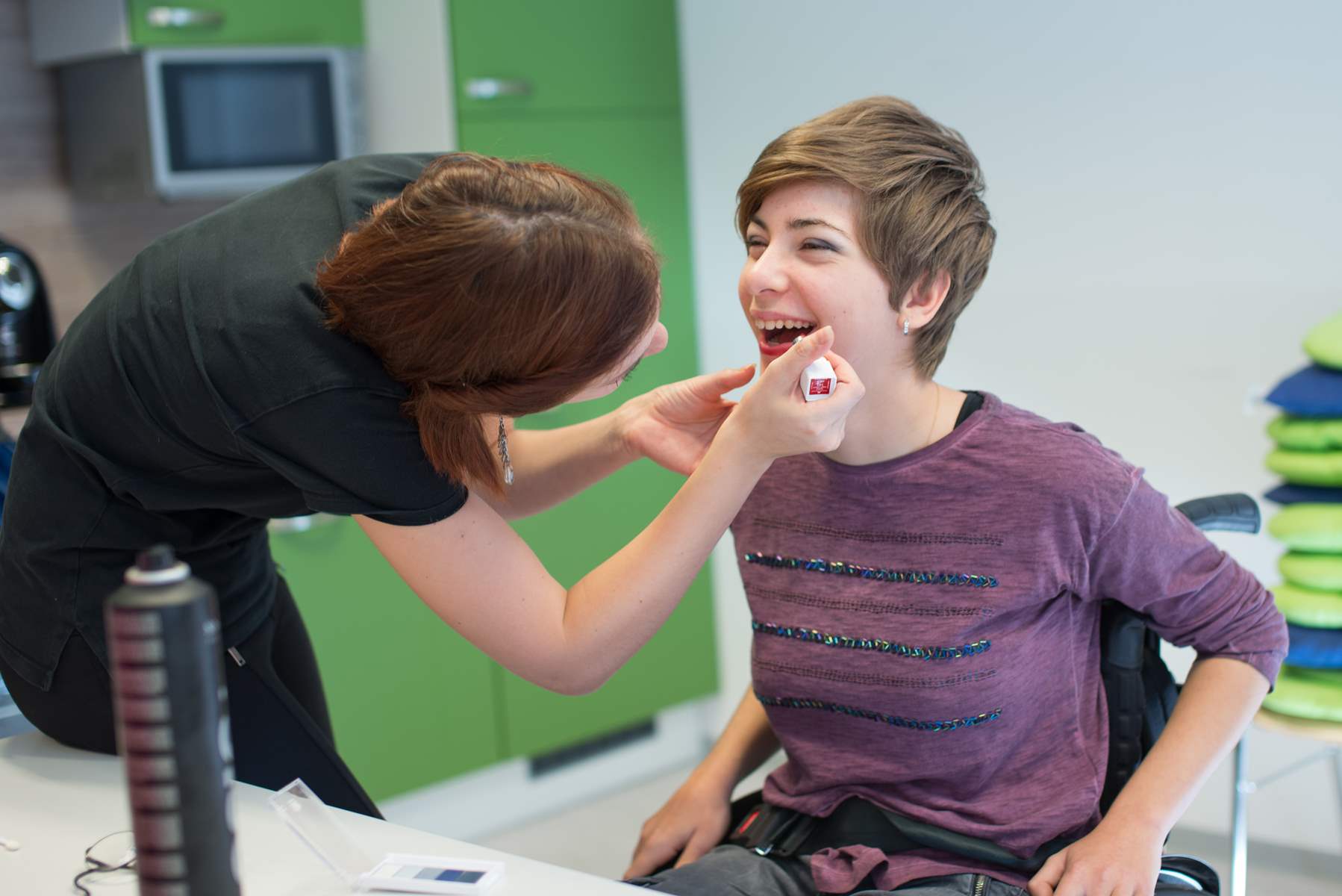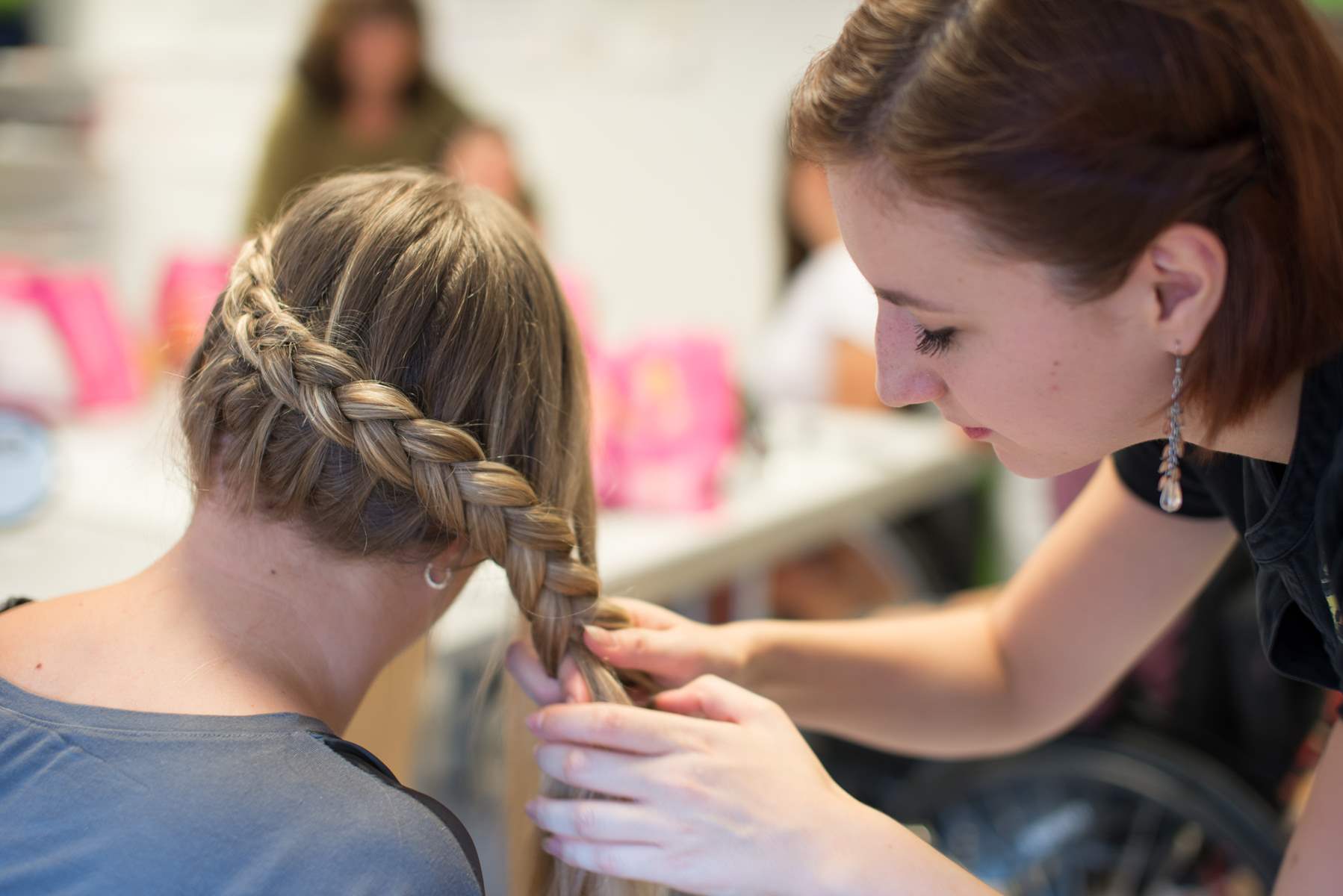 Nachdem jeder mit einer dm Tasche versorgt war, ging’s hinauf in den Aufenthaltsraum des Filialteams. Hier konnte die Gruppe in Ruhe die neuen Schätze aus den dm Taschen bewundern und sich bei den dm Schönheitsprofis Isabella (Kosmetikerin Filiale Universitätsplatz), Elisabeth (Stylistin Filiale Universitätsplatz) und Laura (dm Kosmetiklehrling Filiale Wals) ein perfektes Make-up und eine hübsche Frisur zaubern lassen. Die Begeisterung war riesig und am Ende konnte sich jeder über über seinen neuen Look für das Abendprogramm freuen.