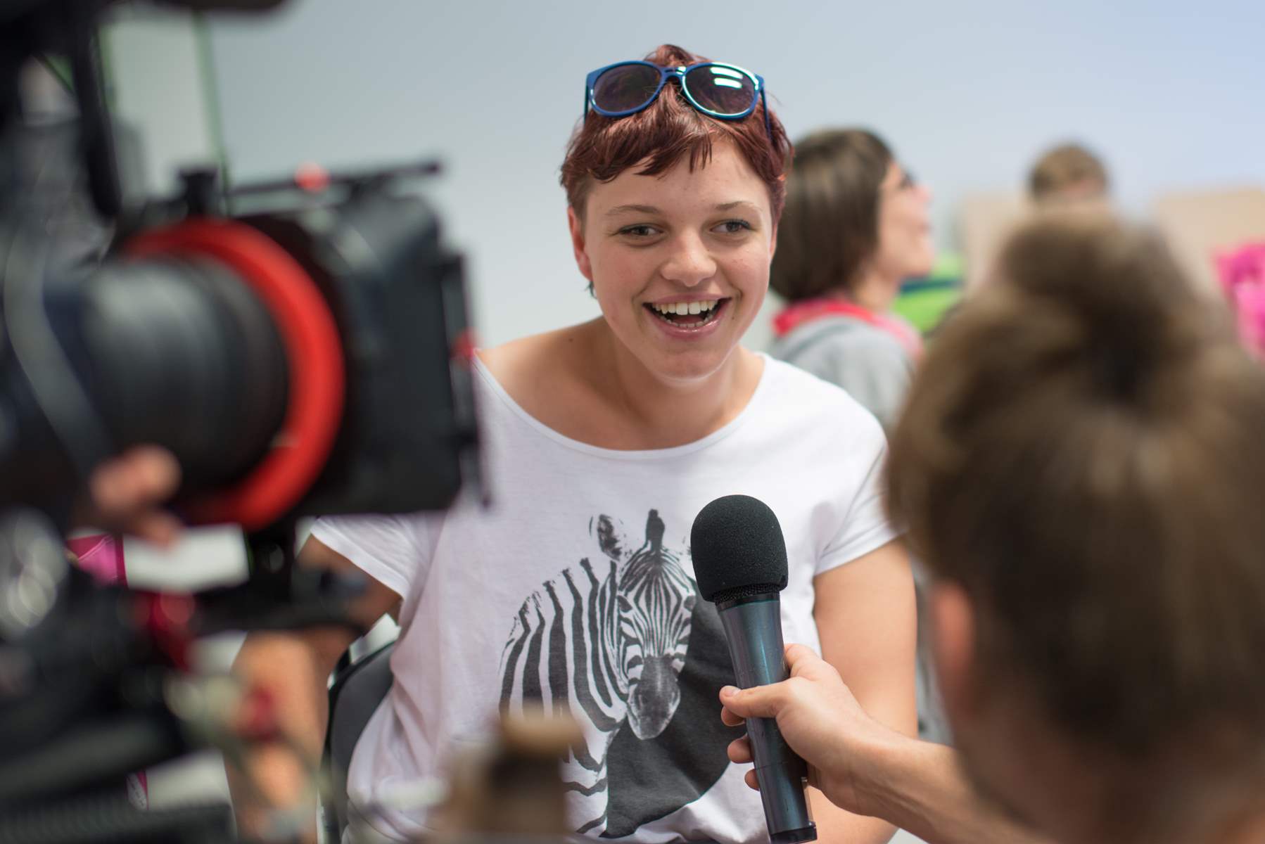 Immer mit dabei war das dm Filmteam, das die Jugendlichen bei ihrem Ausflug in die Shopping Arena begleitete und für Interviews die Jugendlichen selbst, Martina Auberger und Astrid Handlechner vom Verein Rolling Home, die Betreuer und die beteiligten dm Mitarbeiterinnen vor die Kamera bat.