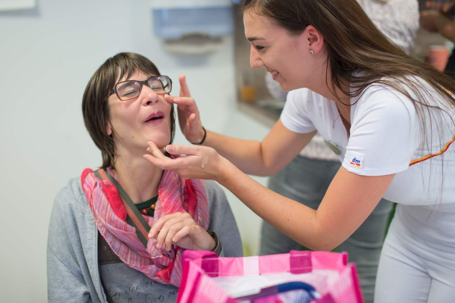 Nach dem gemütlichen Frühstück ging’s mit dem Rollschnecken-Bus in die Shopping Arena zum Einkaufen bei dm. Filialleiterin Patricia Trauner und ein mehrköpfiges dm Team empfingen die aufgeregten Gäste. Mit jeweils mindestens einem Betreuer wurde dann mit den Mädels eine Runde durch die Filiale gedreht. Dabei wanderte so einiges in die von dm gesponserten Taschen: Lippenstift, Wimperntusche, Duschgel, Haarspray, Shampoo, Haarspangen und vieles mehr. Auch Rolli-Fahrer Jonas war zu den Mädels gestoßen – dem Technik-Begeisterten hatten es besonders die Fotoausdruck-Automaten angetan.