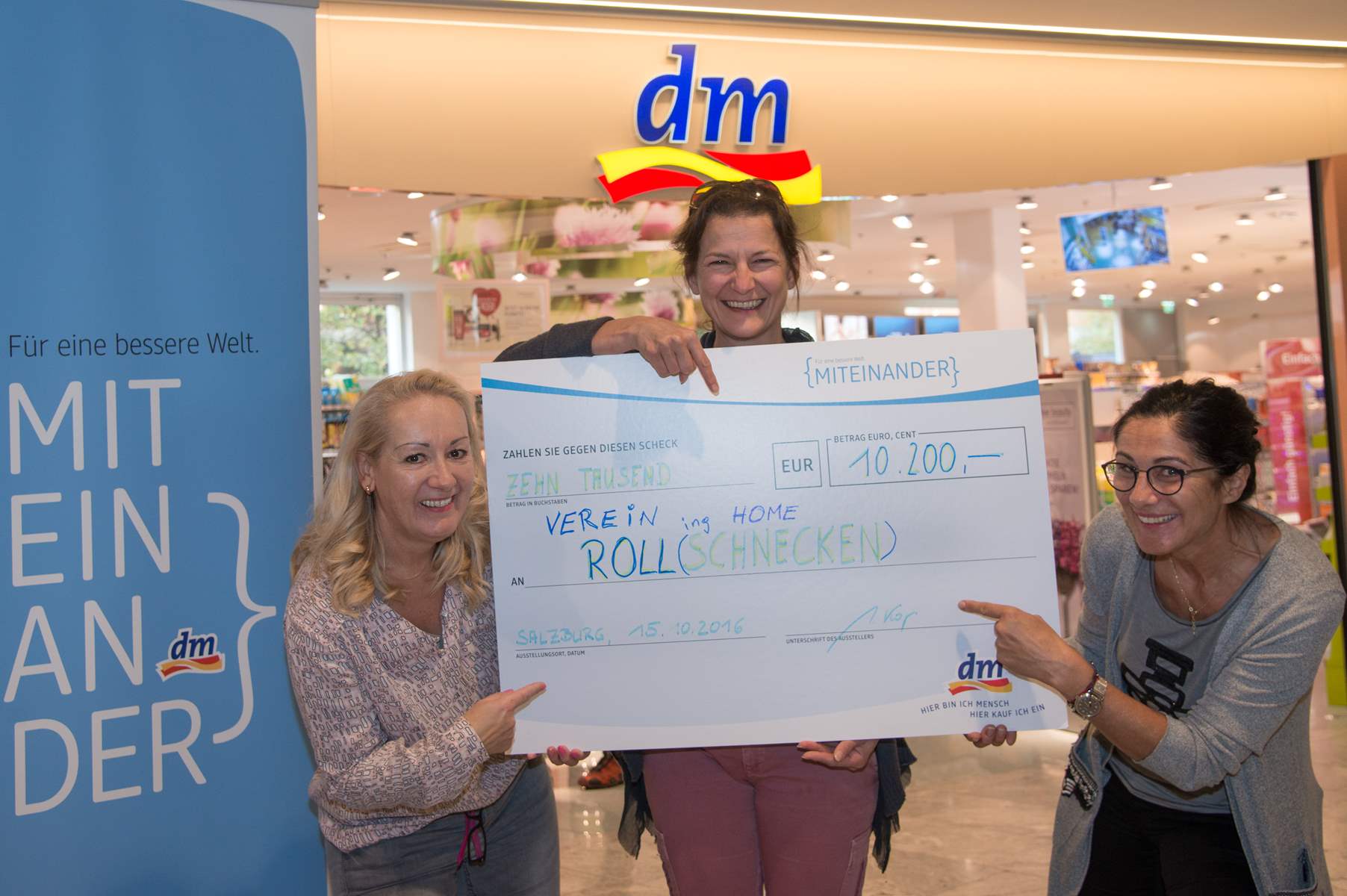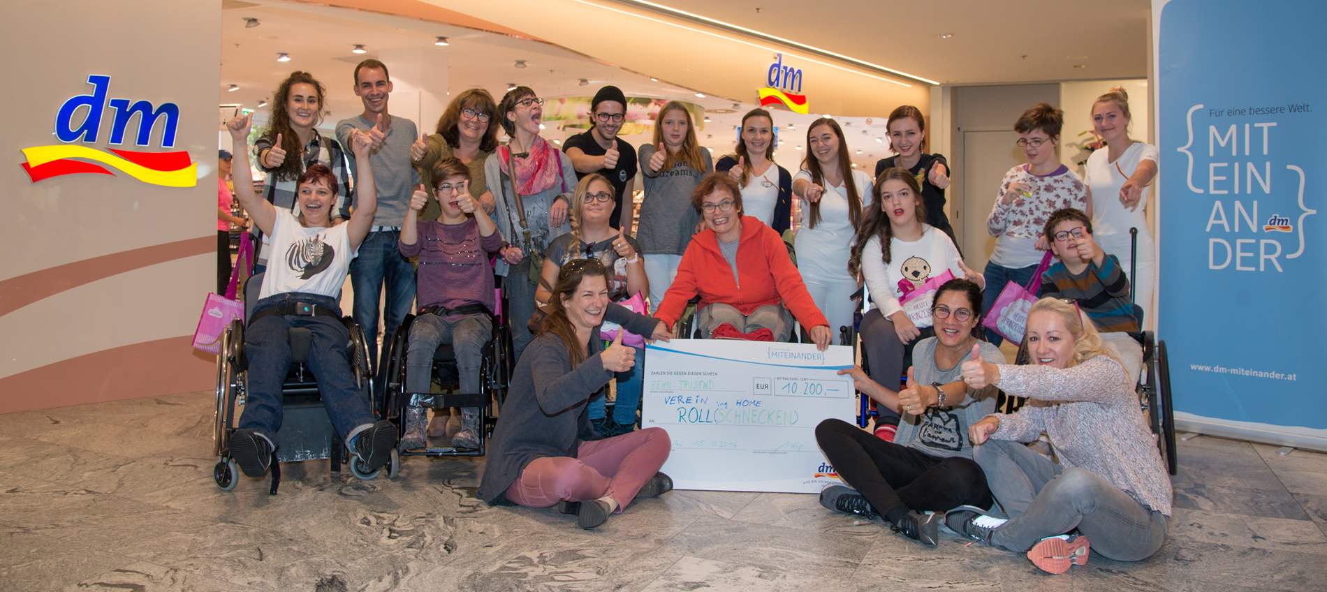Top gestylt ging’s dann wieder für alle zurück zur dm Filiale für die offizielle Scheckübergabe. Insgesamt 10.200 Euro kommen mithilfe von dm, dem Verkauf der {miteinander}-Taschen und durch spendierfreudige dm Kunden dem Verein Rolling Home zugute. Für den noch jungen Verein, der aus den Rollschnecken hervorgegangen ist, ist die Summe ein gewaltiger Schritt nach vorne, um das Vorhaben – elternfreie Wochenenden für Jugendliche mit Behinderung – regelmäßig umsetzen zu können.