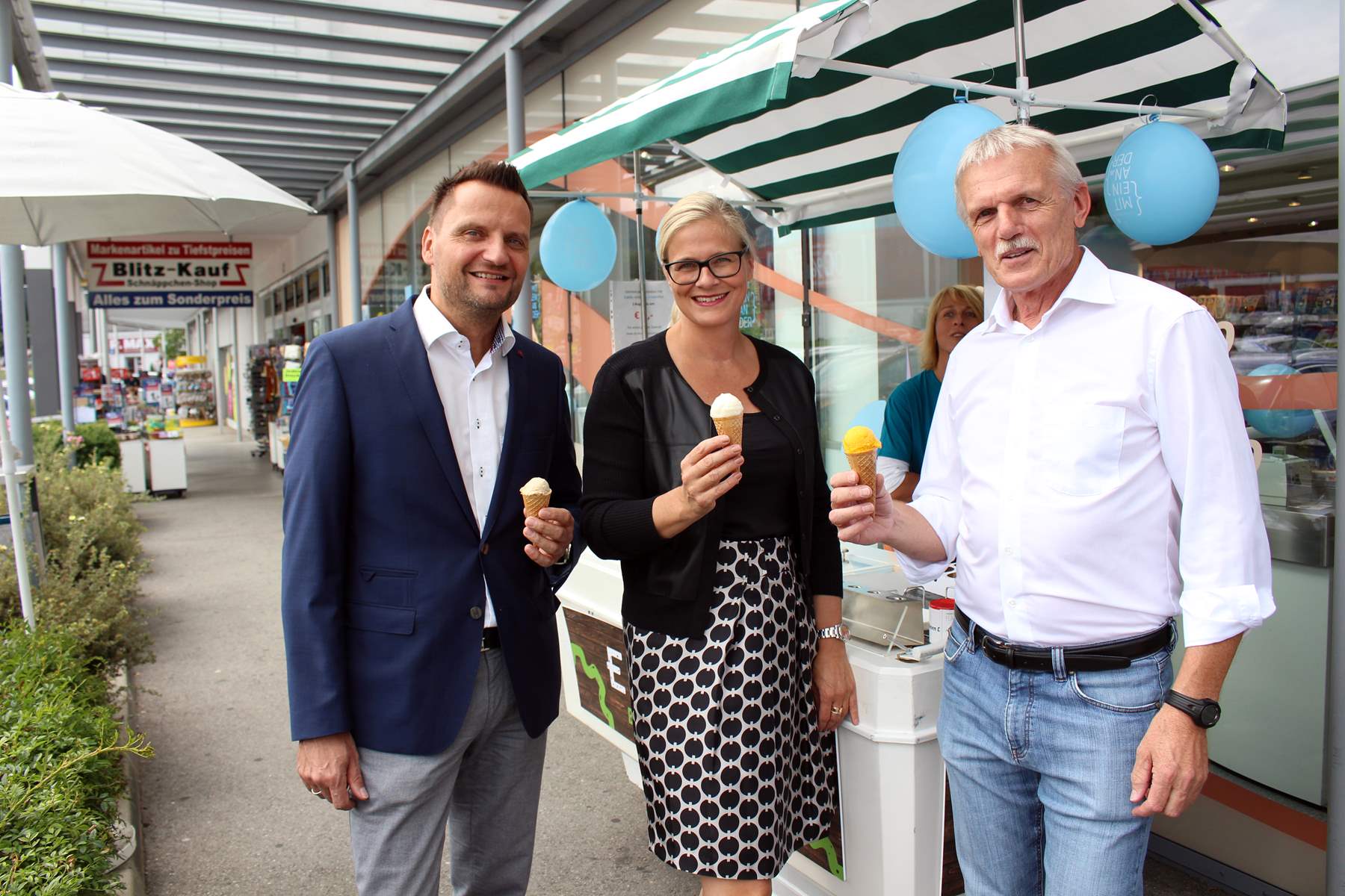 Mit der Firma Bernit Naturstein & Fliesen aus Straßwalchen war übrigens auch ein großzügiger Sponsor des Projekts Flachgauer Tafel zu Gast bei der mobilen Eistheke in Eugendorf. Christine Berendt und Jörg Wagner, Geschäftsführer des Fliesen- und Natursteinhändlers Bernit, trafen sich mit Georg Girlek von der Flachgauer Tafel und dm Gebietsmanager Arnulf Kofler zu einer Kugel Bio-Eis und tauschten sich über die Fortschritte des Projekts aus. Die Firma Bernit unterstützt das Projekt mit einer Finanzspritze von 5.000 Euro – warum, das erzählen die beiden Geschäftsführer im Interview!