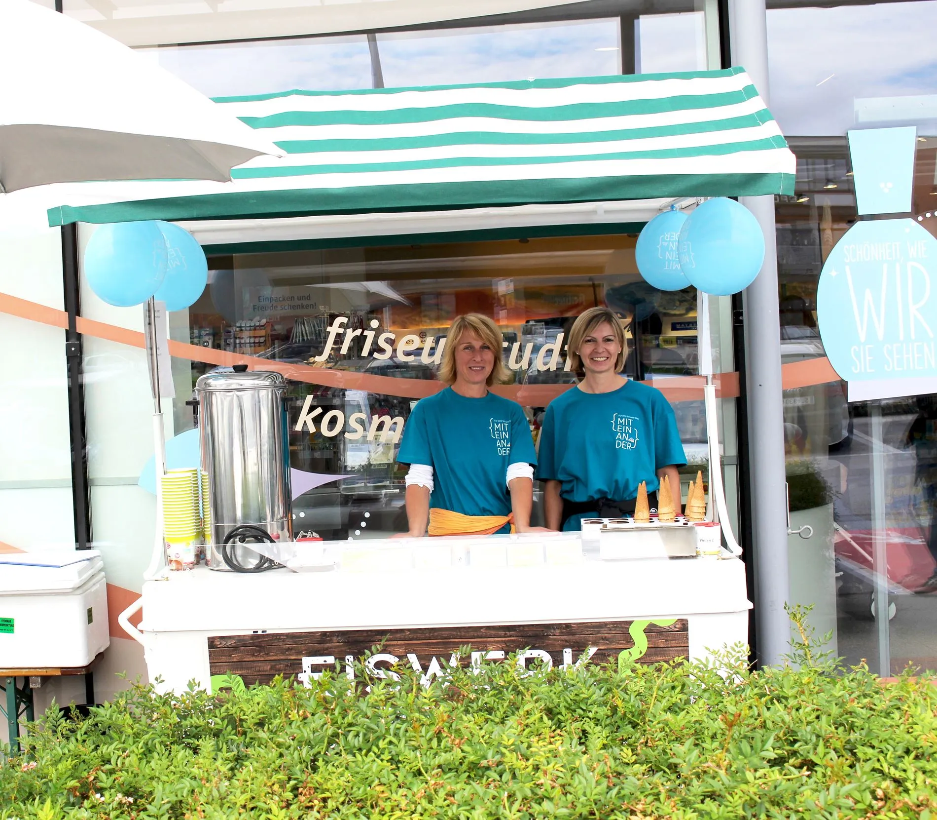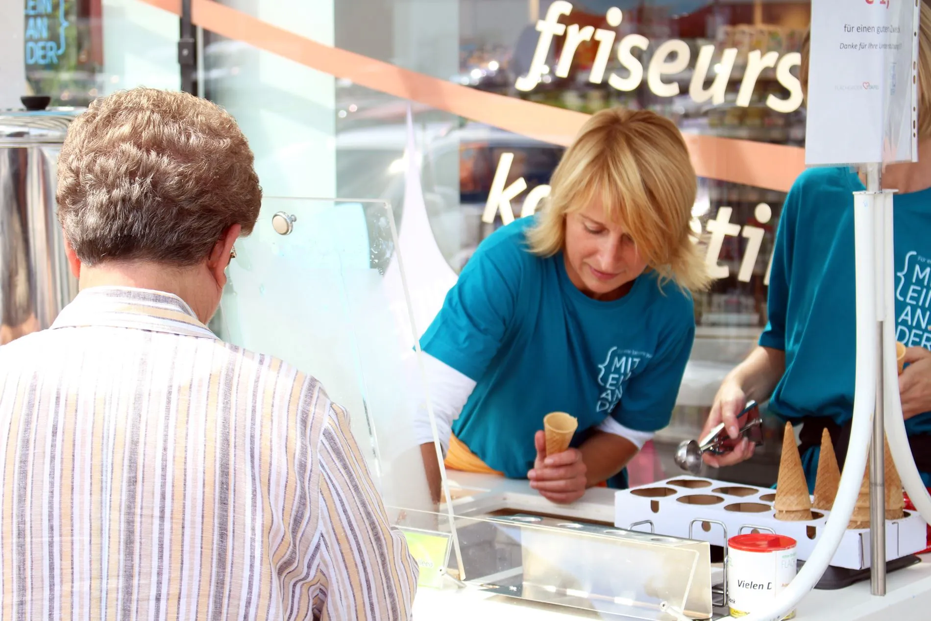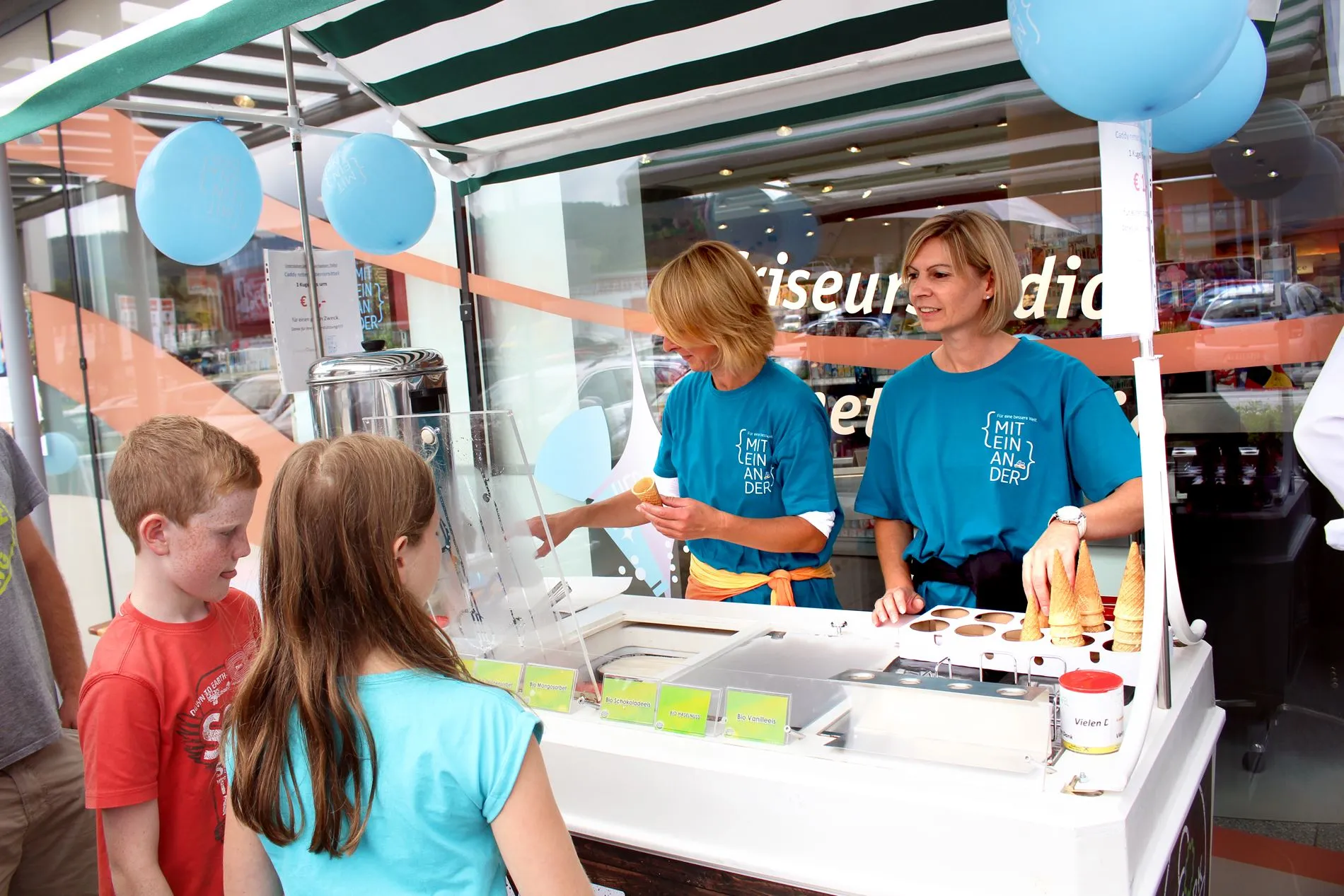 „Wir fallen richtig auf mit unserem Stand! Die Leute fragen oft nach, warum wir jetzt auch Eis anbieten. Wenn wir ihnen den Zweck der Eistheke erklären, sind die meisten sofort bereit, ein oder zwei Kugeln Eis zu kaufen – auch wenn der Magen voll ist!“, schmunzelt Daniela Wimmer, Mitarbeiterin in der dm Zentrale, die bei der Eistheke am Freitag mithalf. „Eine Kundin kannte die Eistheke sogar schon von ihrer Stammfiliale in Obertrum – aber auch bei uns hat sie zugeschlagen!“