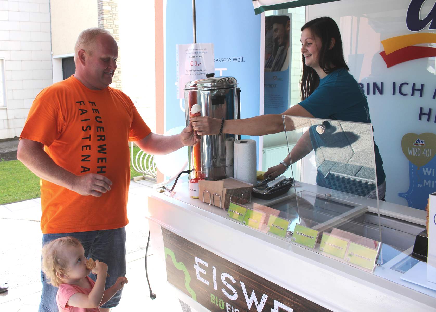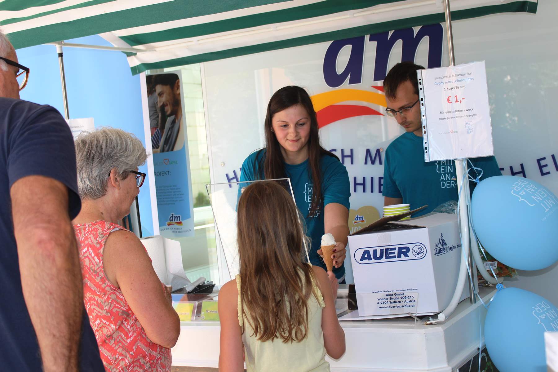 Alexander Dorfmayr aus der dm Zentrale hat Filialleiterin Alexandra Schwaighofer am ersten Tag beim Verkauf unterstützt: "Nach einem ruhigen Start gegen 11 Uhr kam der Eisverkauf ab Mittag wirklich super in Fahrt. Alex und ich konnten unser gestecktes Tagesziel sogar um ein paar Euro übertreffen. Die Kunden haben sehr positiv auf unseren Eisverkauf reagiert – eine Kundin hat sogar ihren 'Nuller-Tag' für uns gebrochen, um eine Kugel für den guten Zweck zu konsumieren. Es war ein wirklich sehr unterhaltsamer Tag – ich konnte mit vielen netten Menschen ins Gespräch kommen. Dass wir von der Firma einen Extra-Urlaubstag für den Verkauf bekommen haben, hat alle Kunden positiv überrascht – ebenso wie das große soziale Engagement von dm, welches ich wegen der Kampagne {miteinaner} mehrmals genau erklären durfte."