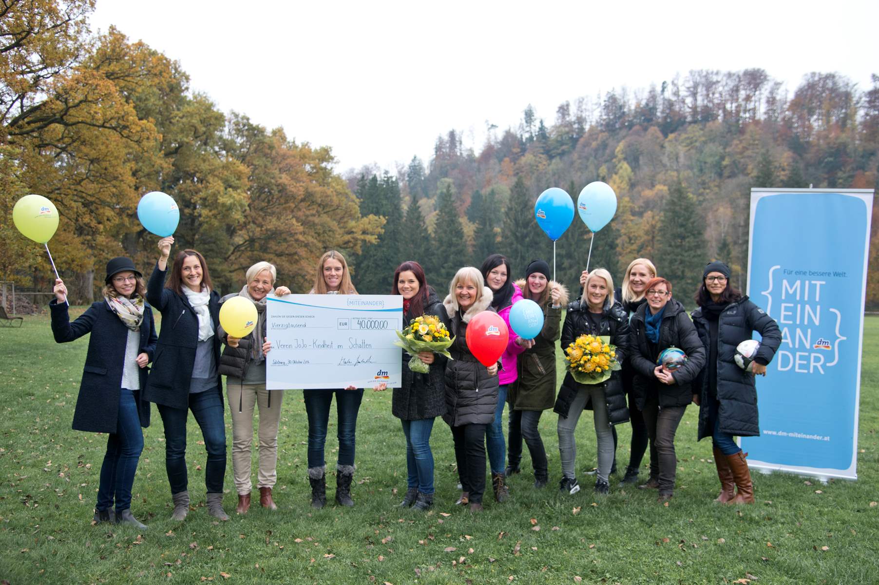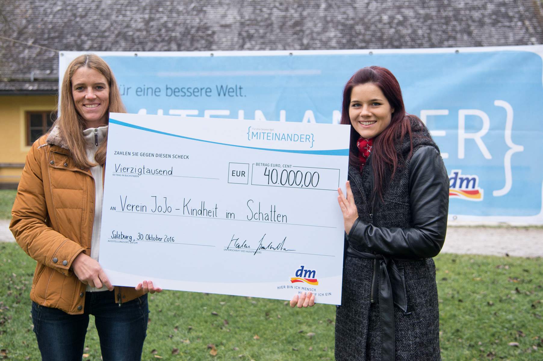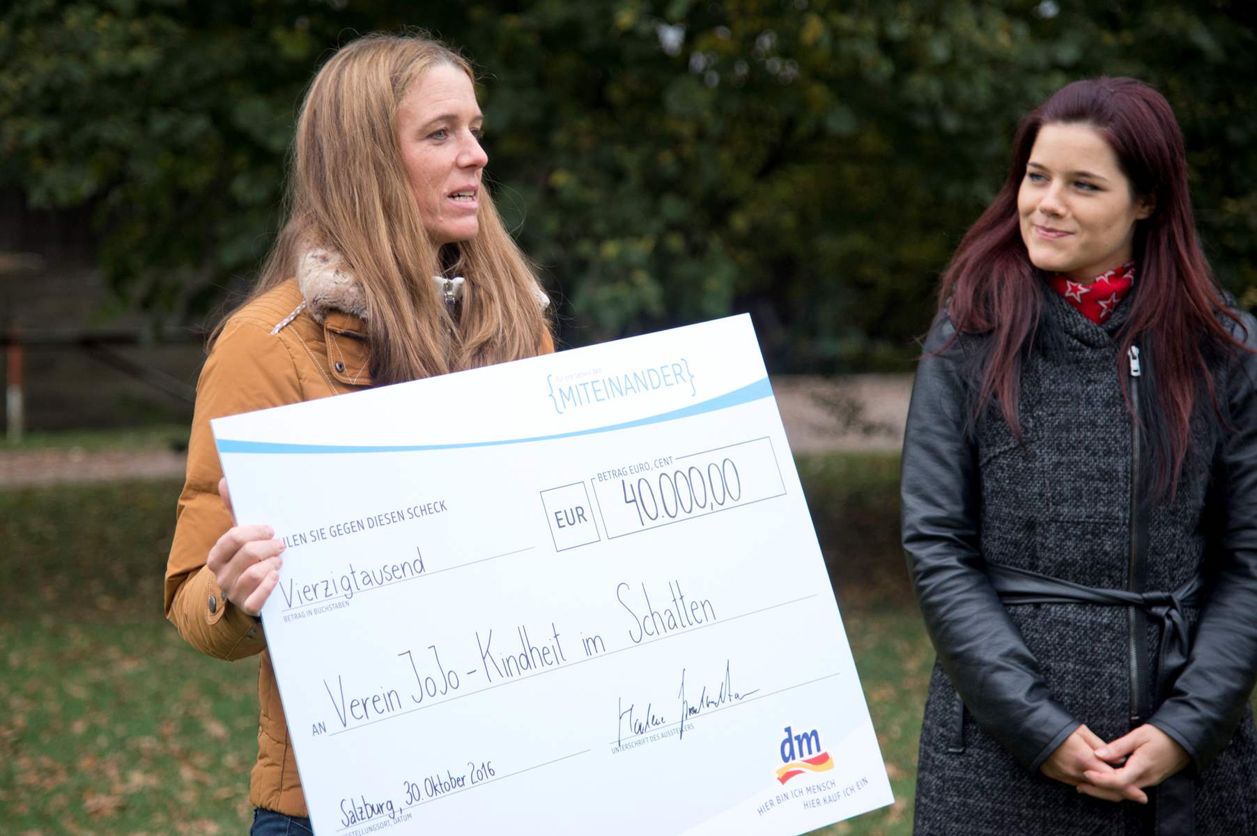 Zum gemeinsamen Abschlussfest auf der Spielwiese im Hellbrunner Schlosspark waren zahlreiche Unterstützer von dm und Mitarbeiter des Vereins gekommen, um noch einmal das gemeinsame Projekt Revue passieren zu lassen und vor allem die offizielle Scheckübergabe an den Verein JoJo - Kindheit im Schatten zu feiern. Stolze 40.000 Euro stehen auf dem Scheck, den dm Projektkoordinatorin Marlene Draschwandtner an JoJo übergab. "Die Summe setzt sich aus den Geldern, die die teilnehmenden Filialen mit ihren Aktionen gesammelt haben, sowie einer finanziellen Unterstützung durch dm drogerie markt zusammen", erklärt Marlene Draschwandtner. "Ich möchte mich bei allen Mitarbeiterinnen, die sich dem Projekt angeschlossen haben, bedanken - wir konnten in den letzten Wochen erleben, was Hilfsbereitschaft und soziales Miteinander bedeuten!" JoJo-Geschäftsführerin Heidemarie Eher durfte den Scheck entgegennehmen: "Ich bin richtig sprachlos! Mit dem Geld können wir so vieles für die Kinder, die wir bei JoJo betreuen, bewegen. Vielen Dank an alle Unterstützer!"