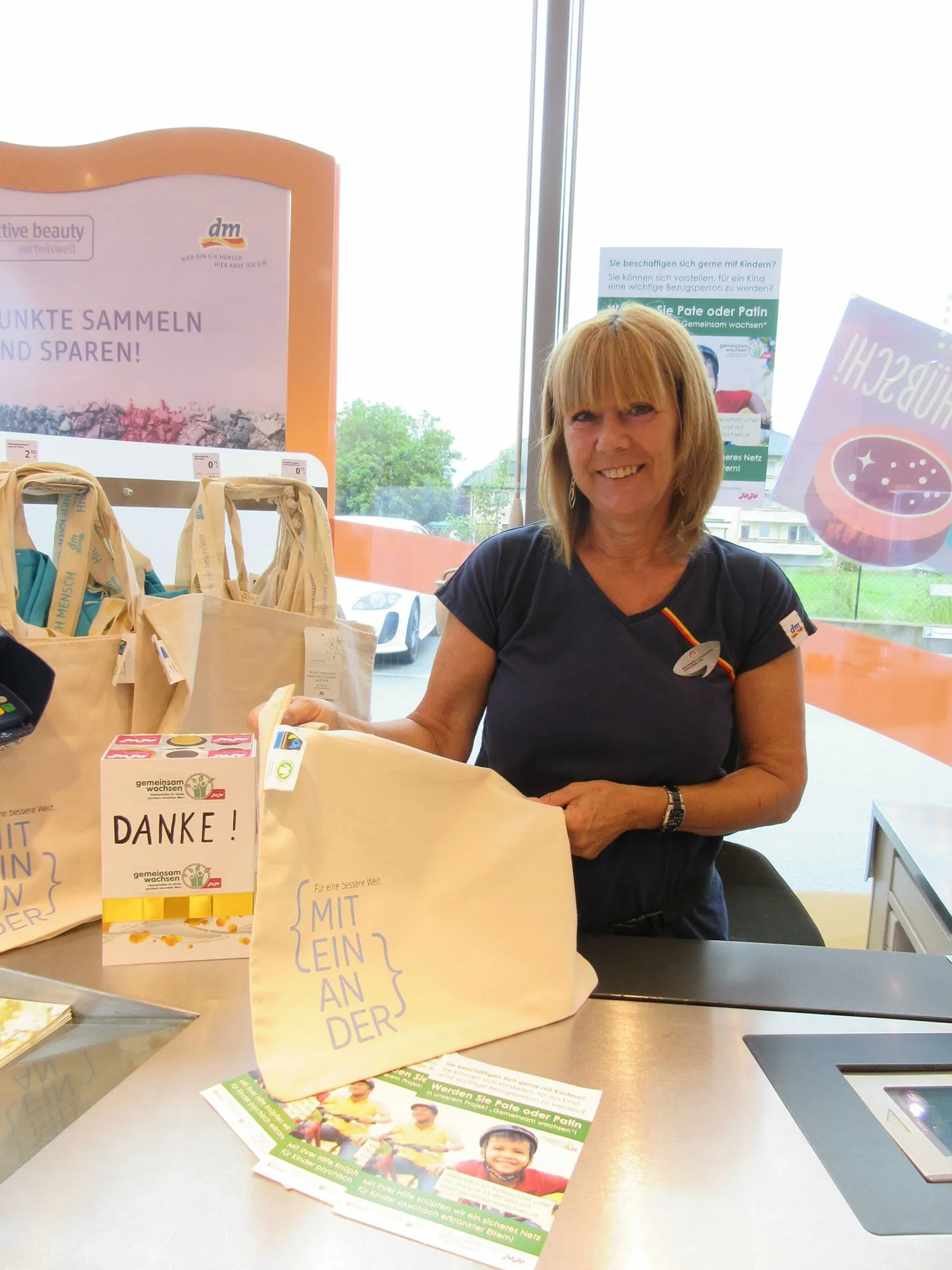 Täglich besuchen zahlreiche Kunden die dm Filialen in und um Salzburg – ein Glücksfall für das Projekt, denn jeder Einzelne von ihnen ist ein potenzieller Pate für JoJo. Mit Plakaten und Handzetteln sollen die Kunden auf den Verein JoJo aufmerksam gemacht werden und im Idealfall die Botschaft des Vereins in das eigene persönliche Umfeld hinaustragen. Um Geld aufzubringen, werden die {miteinander}-Taschen verkauft – pro Tasche geht ein Euro direkt ans Projekt. Im Kassenbereich sind auch Geld-Sammelboxen aufgestellt. Jede Hilfe ist willkommen!