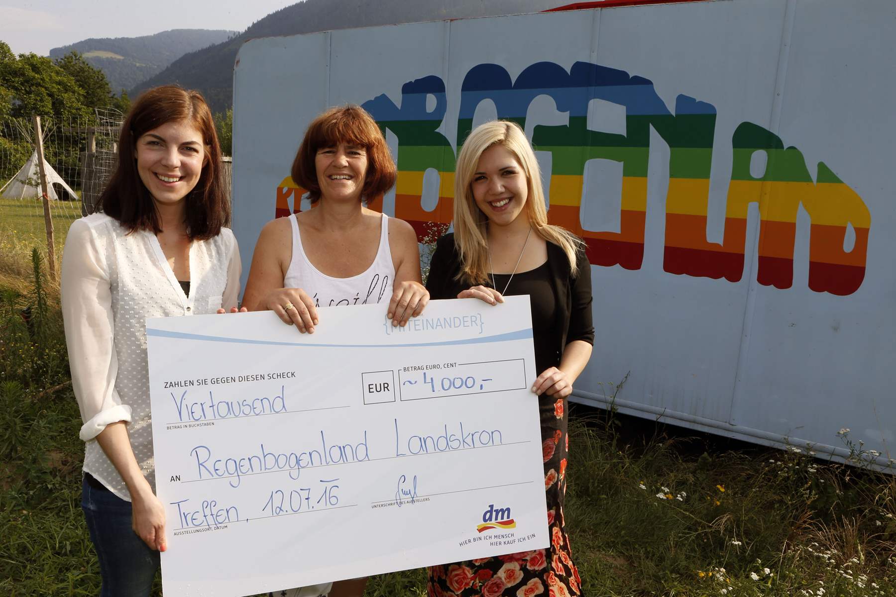 Daniela Wurzer (dm Filiale Treffen), Silvia Lackner (Geschäftsführung Regenbogenland) und Christina Gugl (dm Filiale Velden) bei der Scheckübergabe (v.l.).