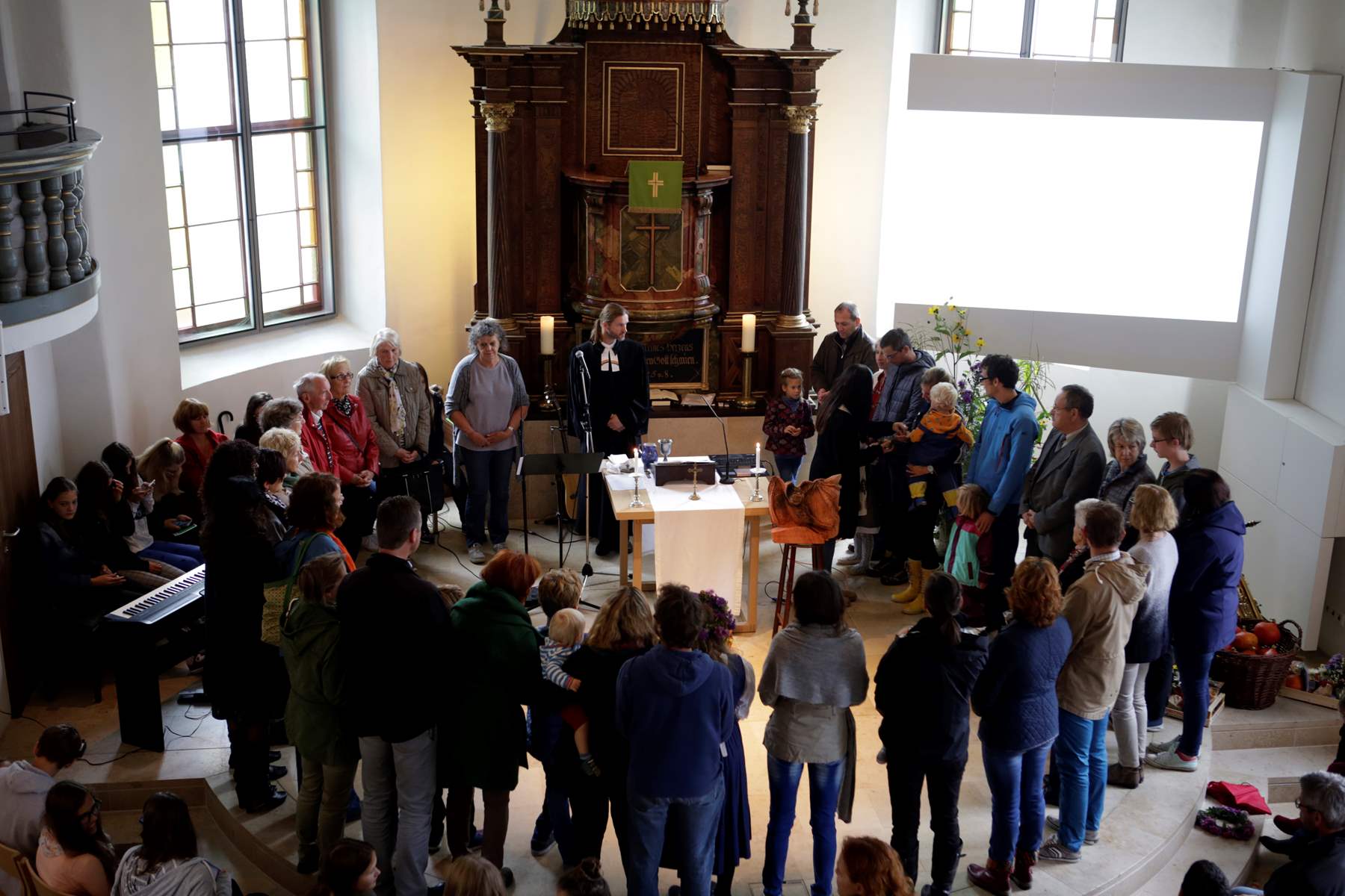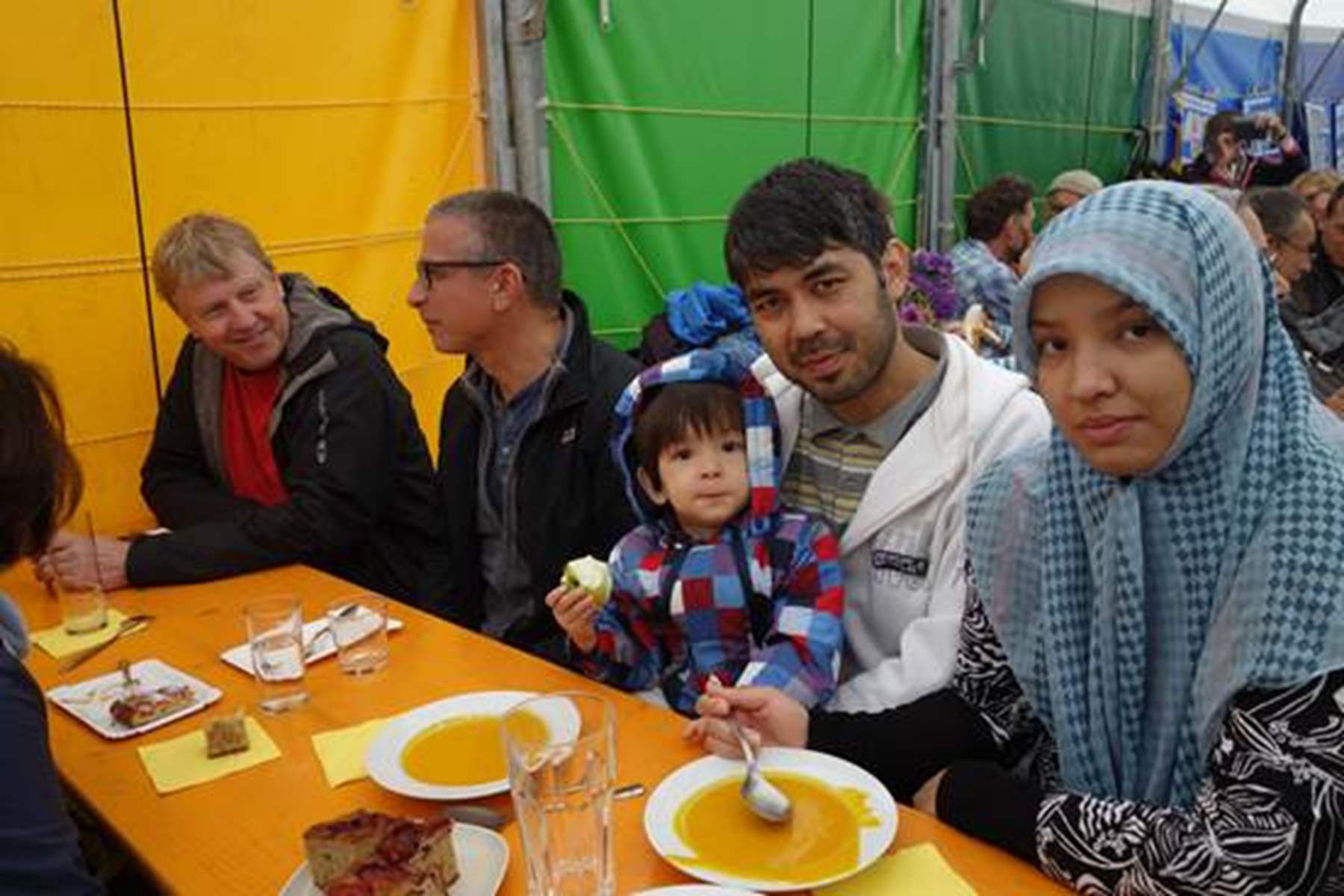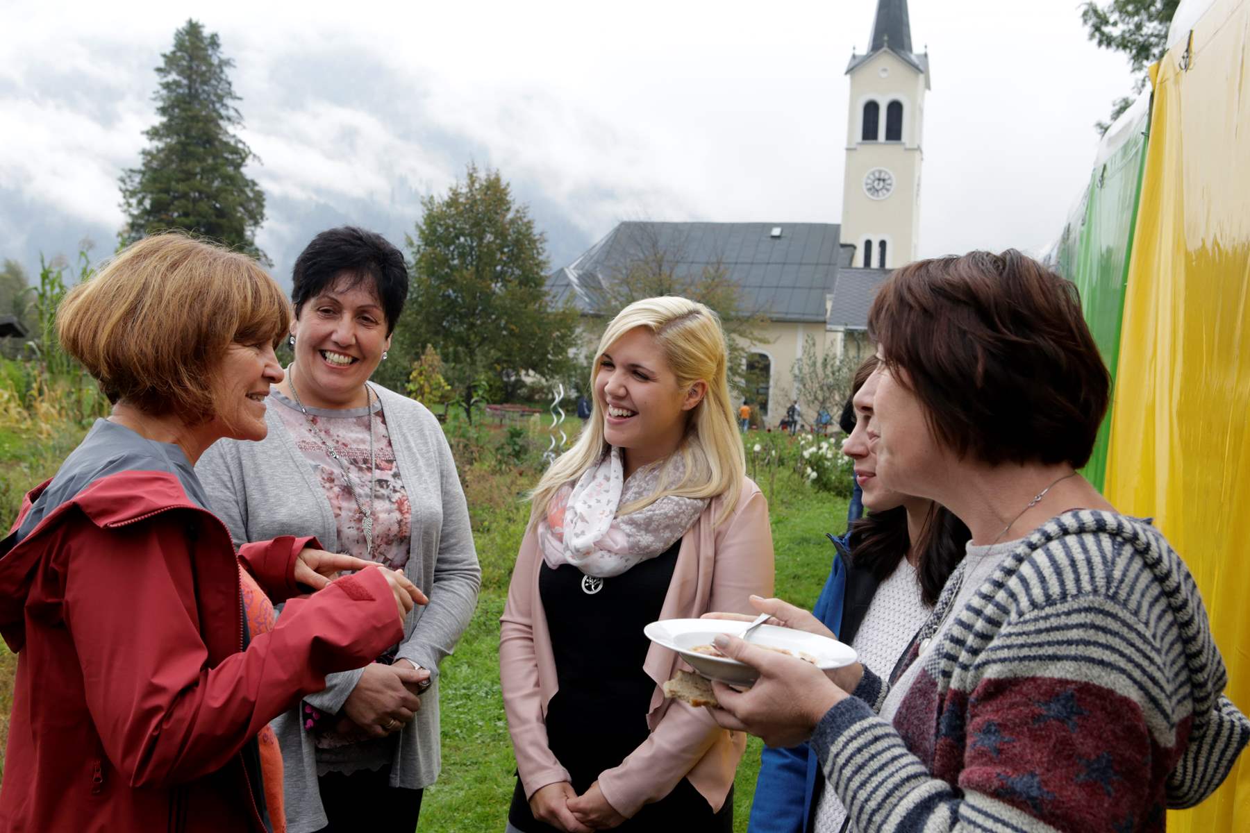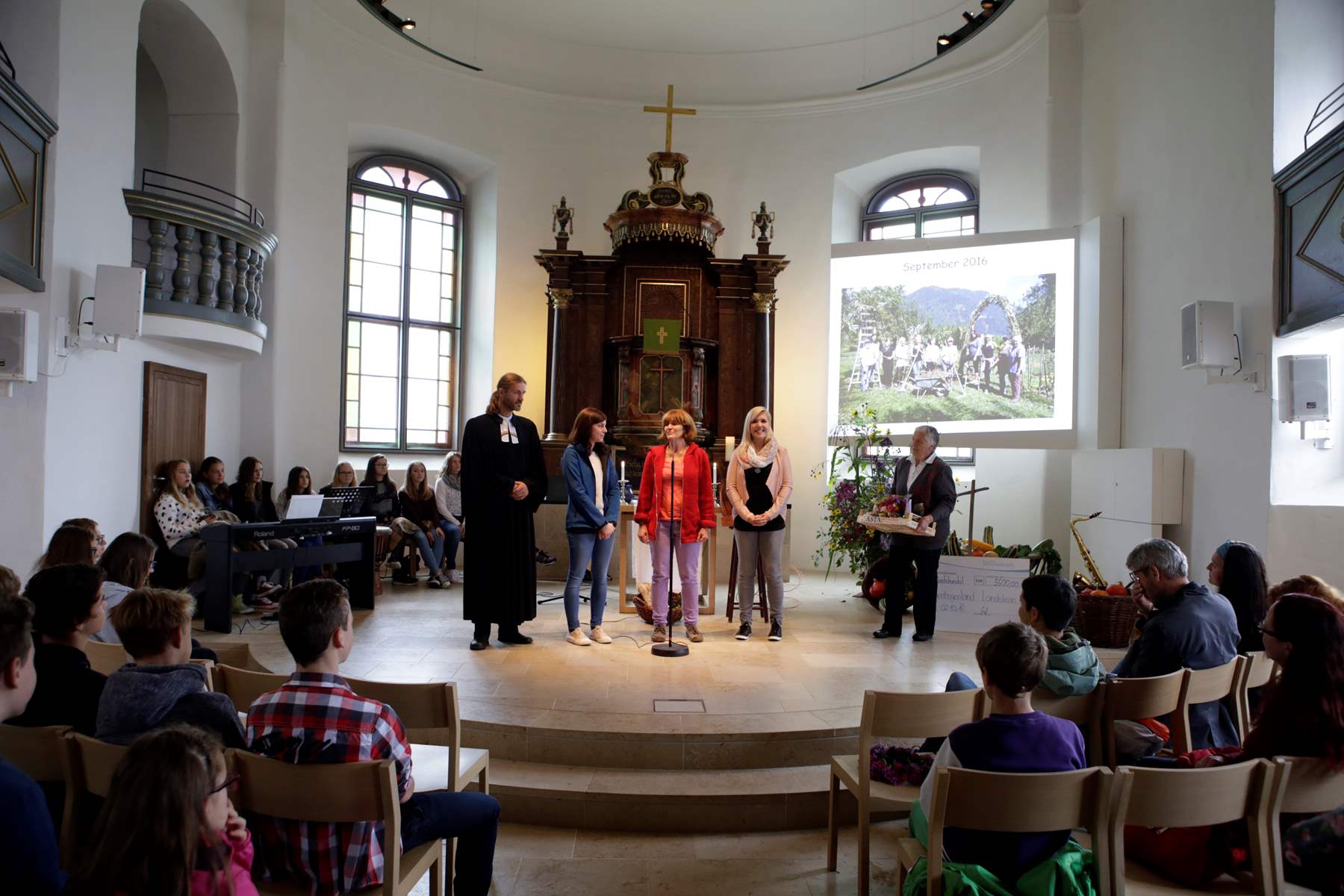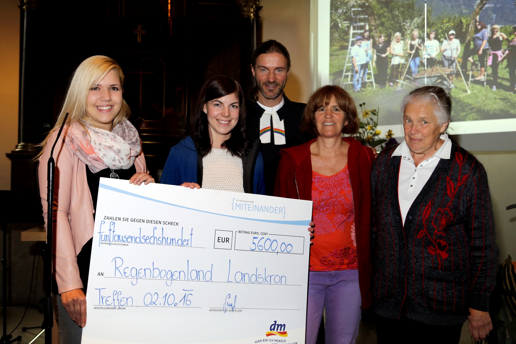 Beim Gottesdienst in der Pfarre Sr. Ruprecht wurde das Thema {miteinander} aufgegriffen und der Scheck von den dm Filialleiterinnen Daniela Wurzer und Christina Gugl an die Vertreter des Regenbogenlandes überreicht. Als Dankeschön für das Engagement gab es eigens gefertigte Blumengestecke und Ernteerzeugnisse aus dem Regenbogenland. Nach dem gemeinsamen Gottesdienst verlagerte sich das Geschehen in den Gemeinschaftsgarten, wo auch die neue Küche nicht kalt blieb und die Gäste mit zahlreichen Köstlichkeiten aus dem Garten versorgt wurden. Neben den reich gedeckten Tischen sorgte auch die Band DEF des schottischen Gärtners David aus dem Regenbogenland für gute Unterhaltung.