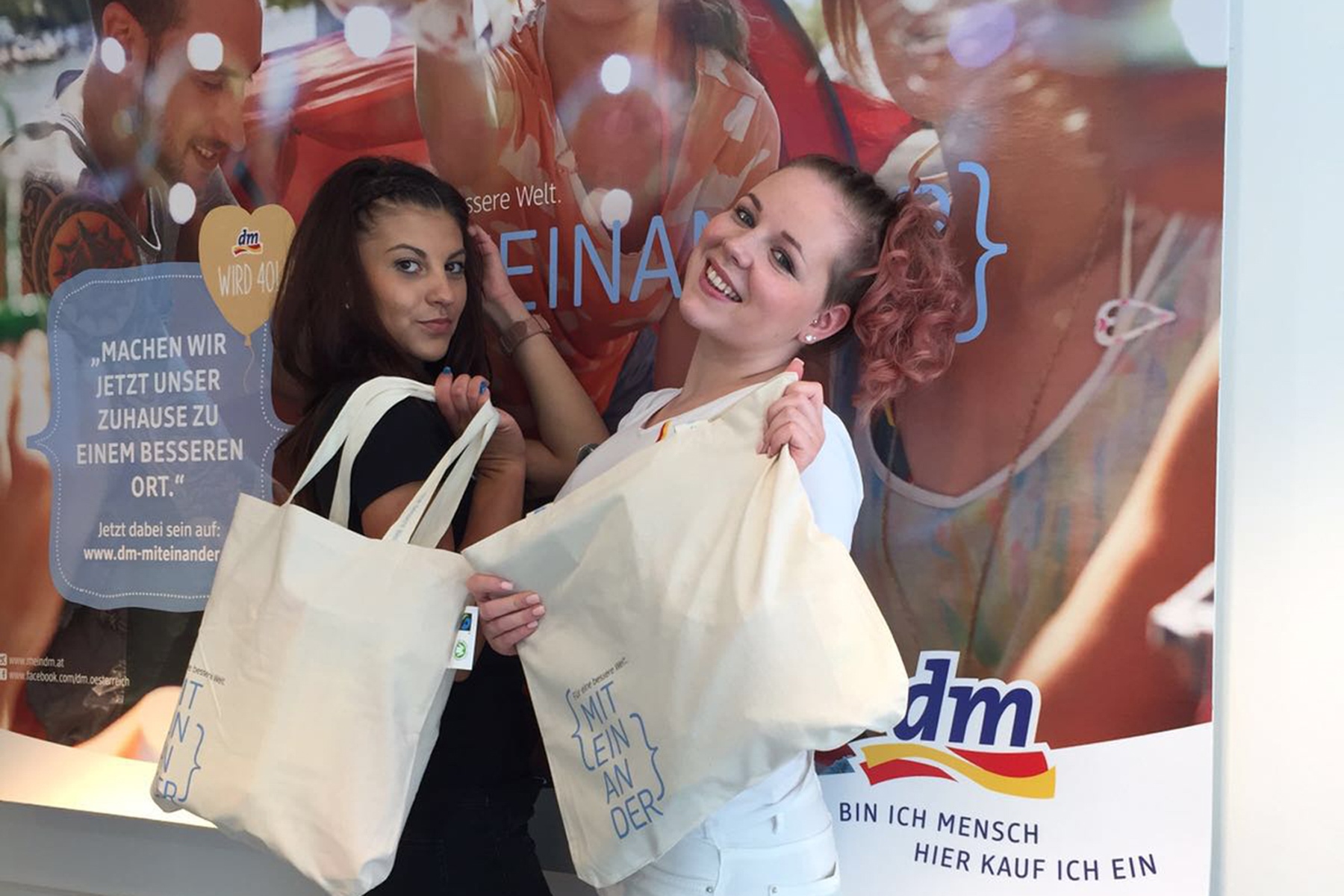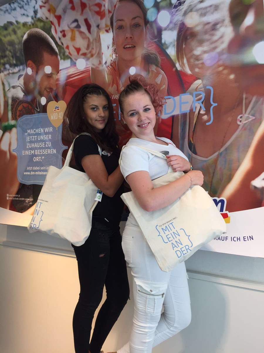 In den teilnehmenden dm Filialen verkaufen wir die {miteinander}-Taschen aus Baumwolle und informieren unsere Kunden zum Projekt. Besonders im dm friseur- und kosmetikstudio haben wir die Gelegenheit, mit unseren Kunden zu plaudern. Sie sind recht interessiert am gemeinnützigen Engagement von dm und reagieren sehr positiv auf unser Projekt.