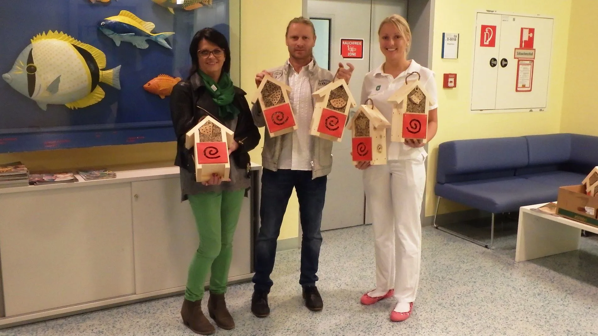 Außerdem übergab Konrad Guggi im Zuge der Aktion und im Beisein von dm Filialleiterin Maria Gruber der Universitätsklinik Graz fix fertig gestaltete Insektenhotels, die den krebskranken Kindern im Laufe eines Jahres nach ihrem Aufenthalt auf der Station mit nach Hause gegeben werden. Über das großzügige Geschenk freuten sich auch Kindergartenpädagogin Eva Gartlgruber von der Pädiatrischen Hämato-/Onkologie für Kinder- und Jugendheilkunde sowie Leiter Univ.-Prof. Dr Ch. Urban.