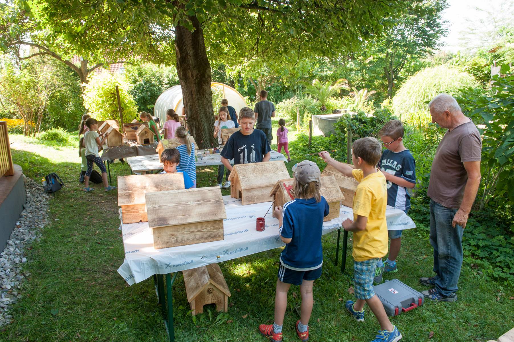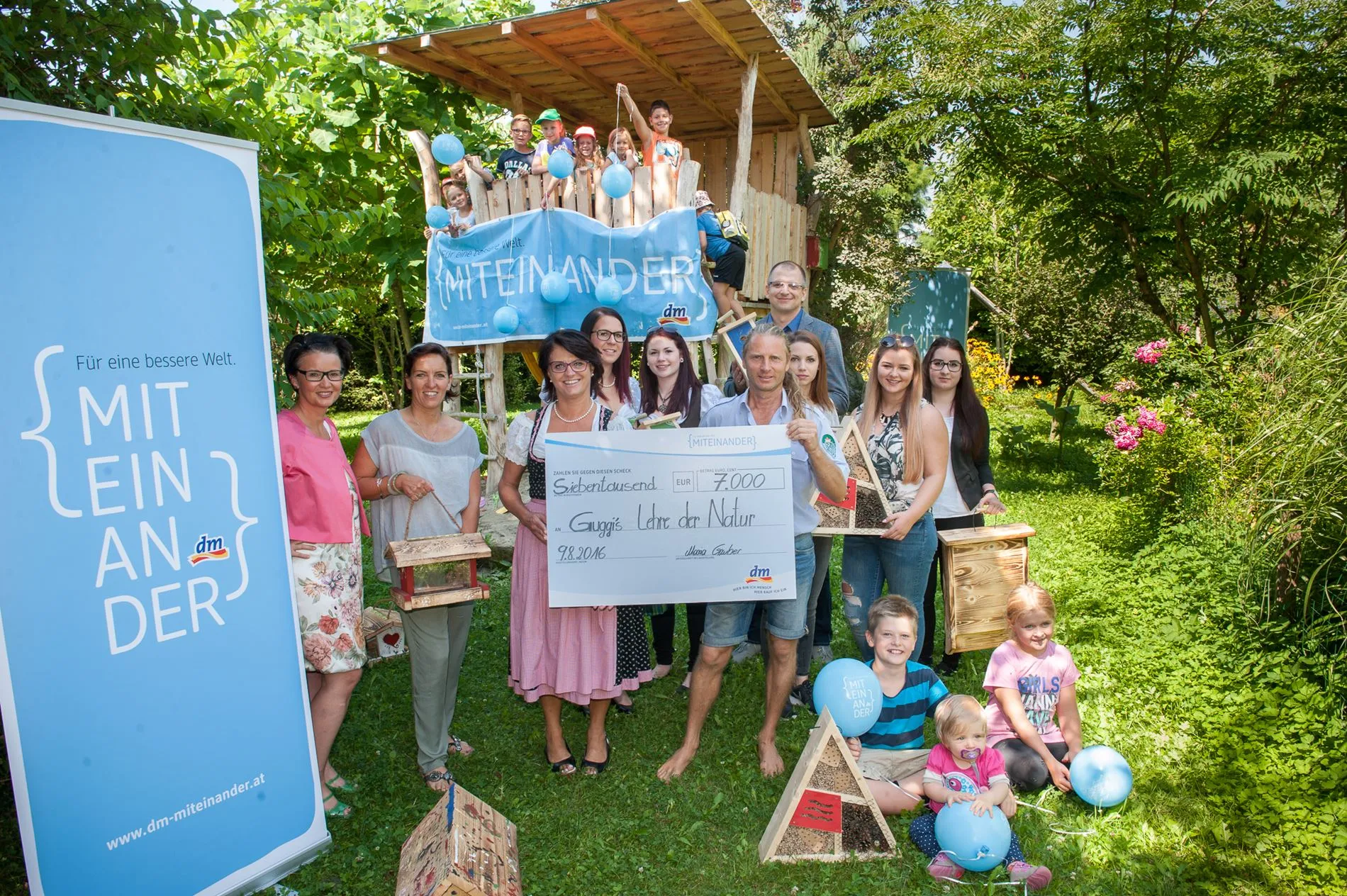 Sie alle strahlten mit der Sonne um die Wette - Konrad Guggi, das engagierte dm {miteinander}-Team aus der Steiermark und die anwesenden Kinder, die einen Workshop in der Naturwerkstatt absolvierten. Grund dafür: Die feierliche Scheckübergabe von dm drogerie markt am 9. August in Unterpremstätten.