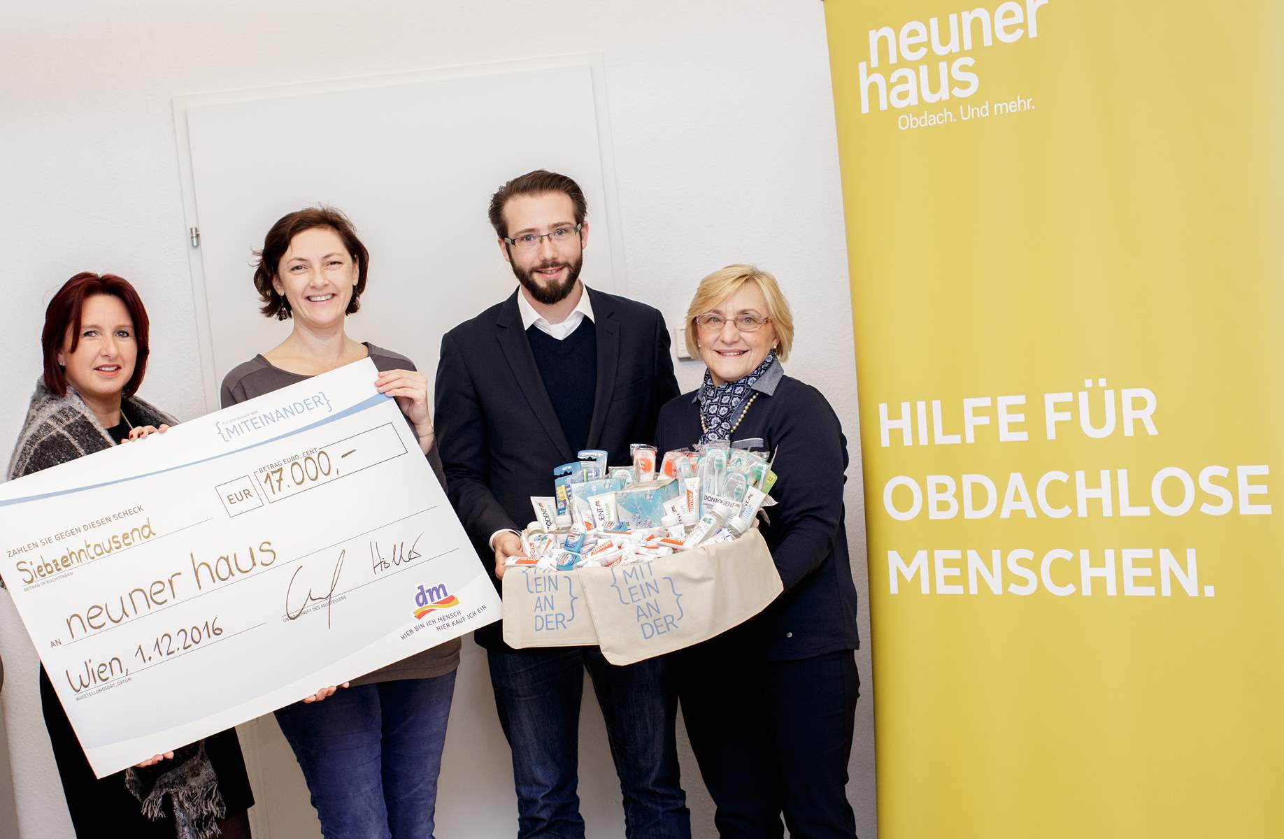 Projektkoordinatorin Flora Höller, Barbara Kumer vom neunerhaus, dm Gebietsmanagerin Sabine Thaler und Gebietsmanager Sebastian Urf bei der Scheckübergabe (v. l.).