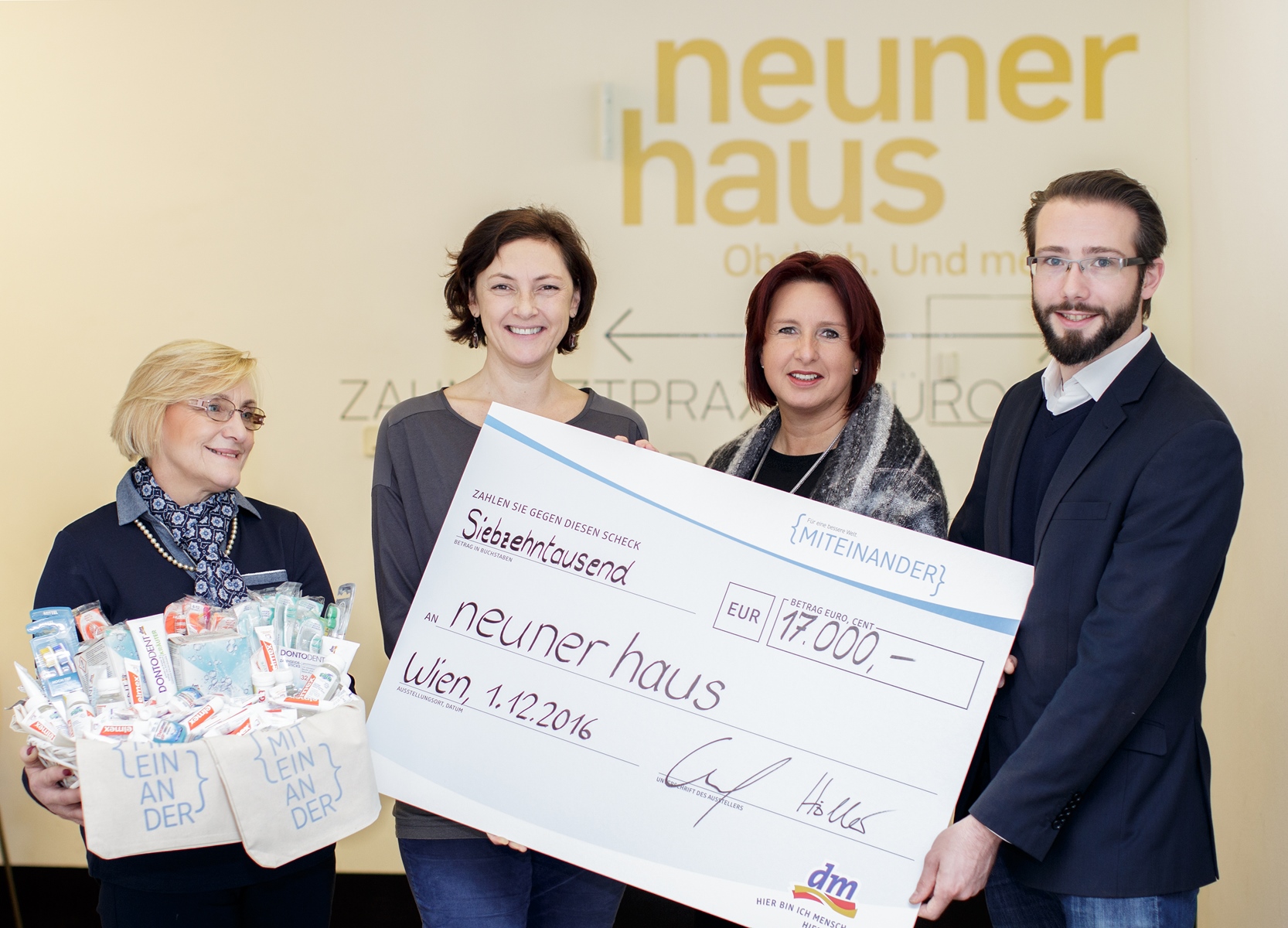Ehrenamtliche Zahnärzte behandeln in der neunerhaus Zahnarztpraxis seit 2009 obdach- und wohnungslose Patienten. Rund 3.600 betroffene Menschen nutzen die medizinischen Angebote sowie Beratungsgespräche pro Jahr. Kürzlich konnte dm drogerie markt neunerhaus ein verfrühtes Weihnachtsgeschenk machen. Mitarbeiter aus 23 dm Filialen in Wien und Niederösterreich haben sich im Rahmen der {miteinander}-Initiative anlässlich des 40-jährigen Firmenjubiläums in Österreich für das neunerhaus engagiert und finanzielle Mittel gesammelt. Bei einem Besuch vor Ort überreichten sie einen Scheck in Höhe von 17.000 Euro und Produktspenden.