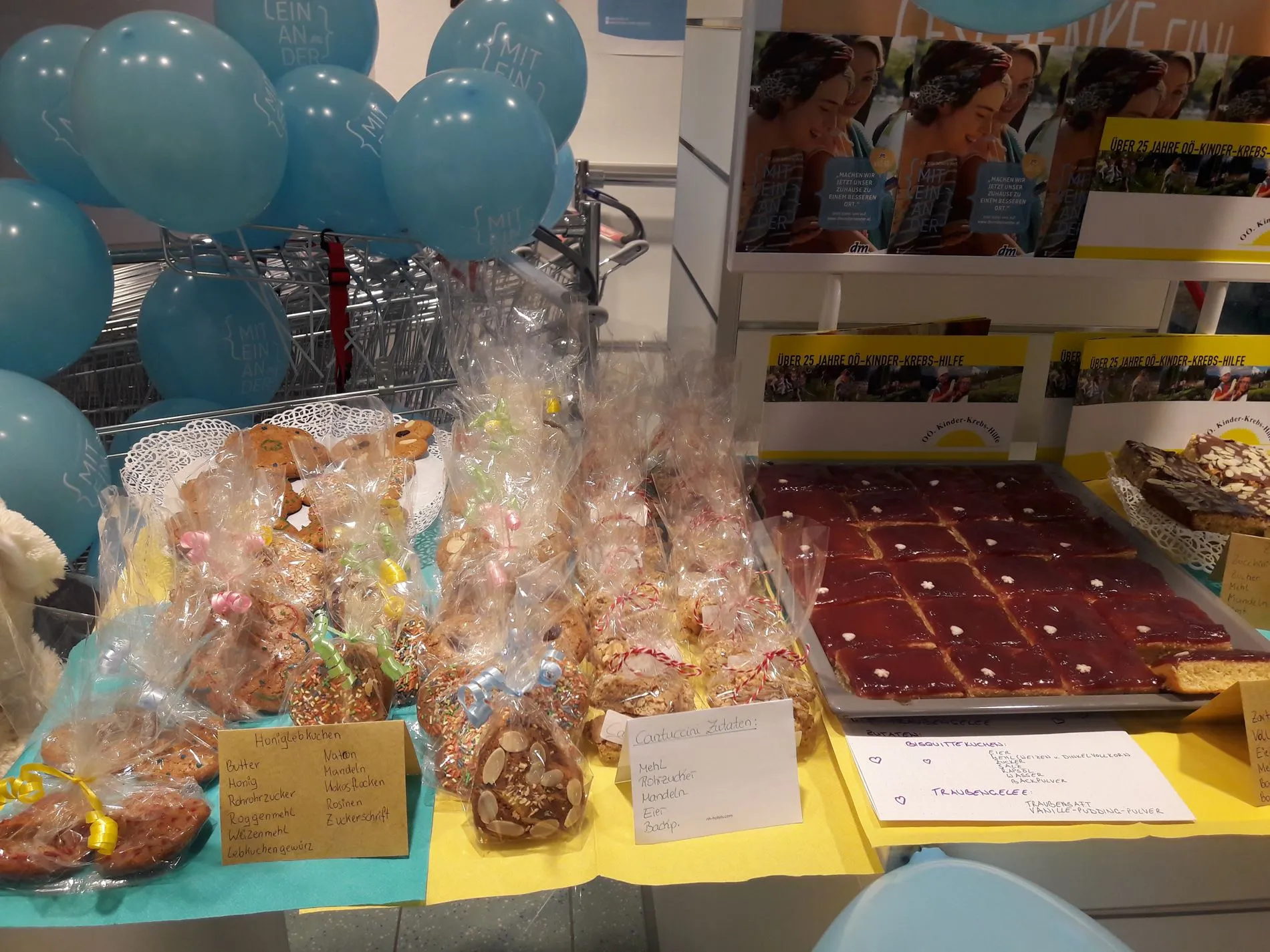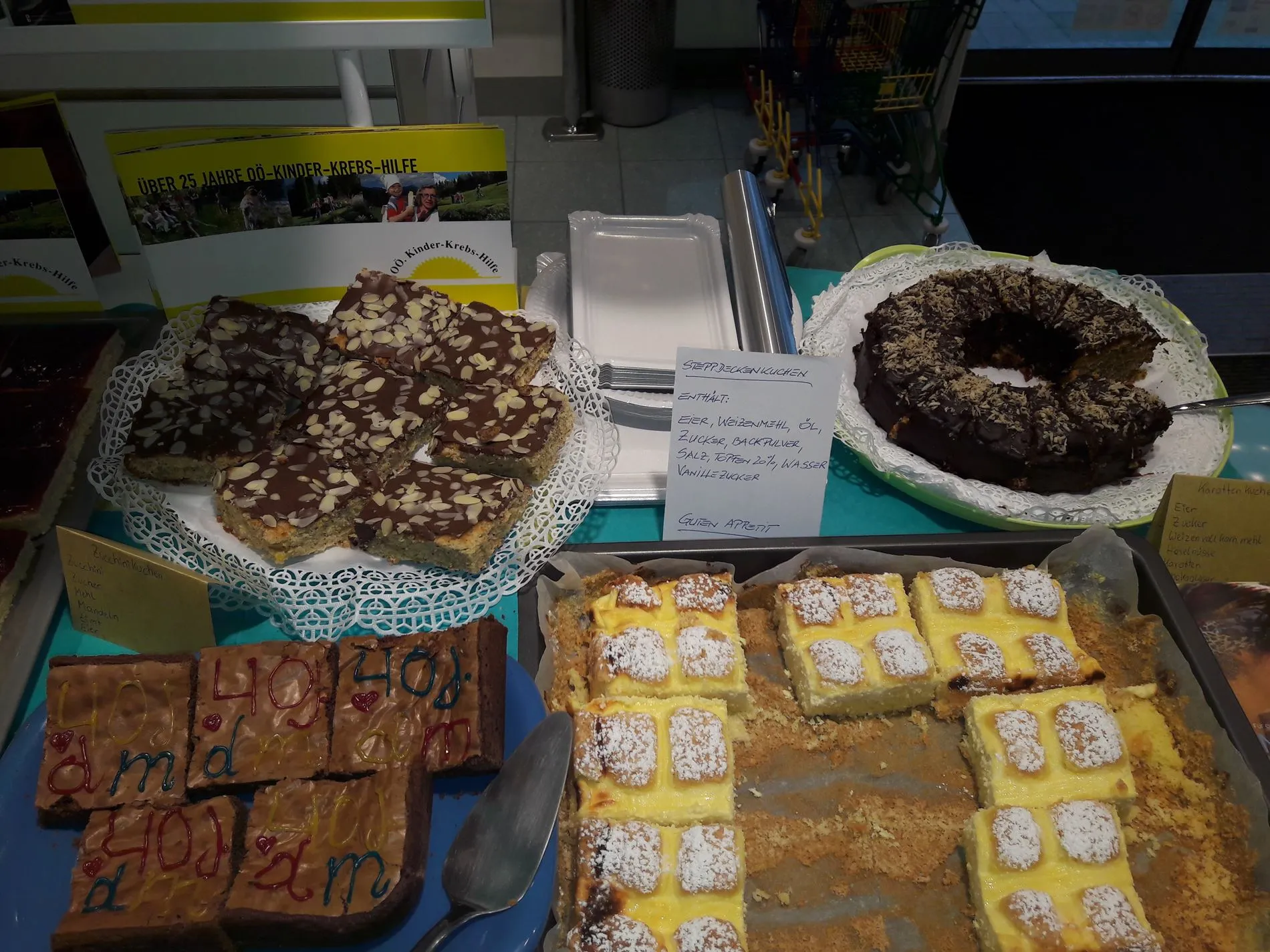 Auch die Kolleginnen ließen sich nicht lange bitten und heizten die heimischen Öfen an. Die delikaten Ergebnisse konnten die Kunden am 17. September in der Filiale nicht nur bewundern, sondern auch gleich verkosten oder mit nach Hause nehmen. Bei saftigen Karotten- und Zucchinikuchen, schokoladigen Brownies oder einzigartigem Steppdecken-Kuchen blieben keine Wünsche offen. Lehrling Magda-Lena Krinninger stand sowohl mit Infos rund um OÖ Kinder Krebs Hilfe als auch mit „Geschmacksberatung“ hilfreich zu Seite. „Die Kunden waren schnell für die Arbeit der OÖ Kinder Krebs Hilfe zu begeistern – ebenso wie für unsere selbstgemachten Mehlspeisen,“ zieht sie lachend Bilanz.