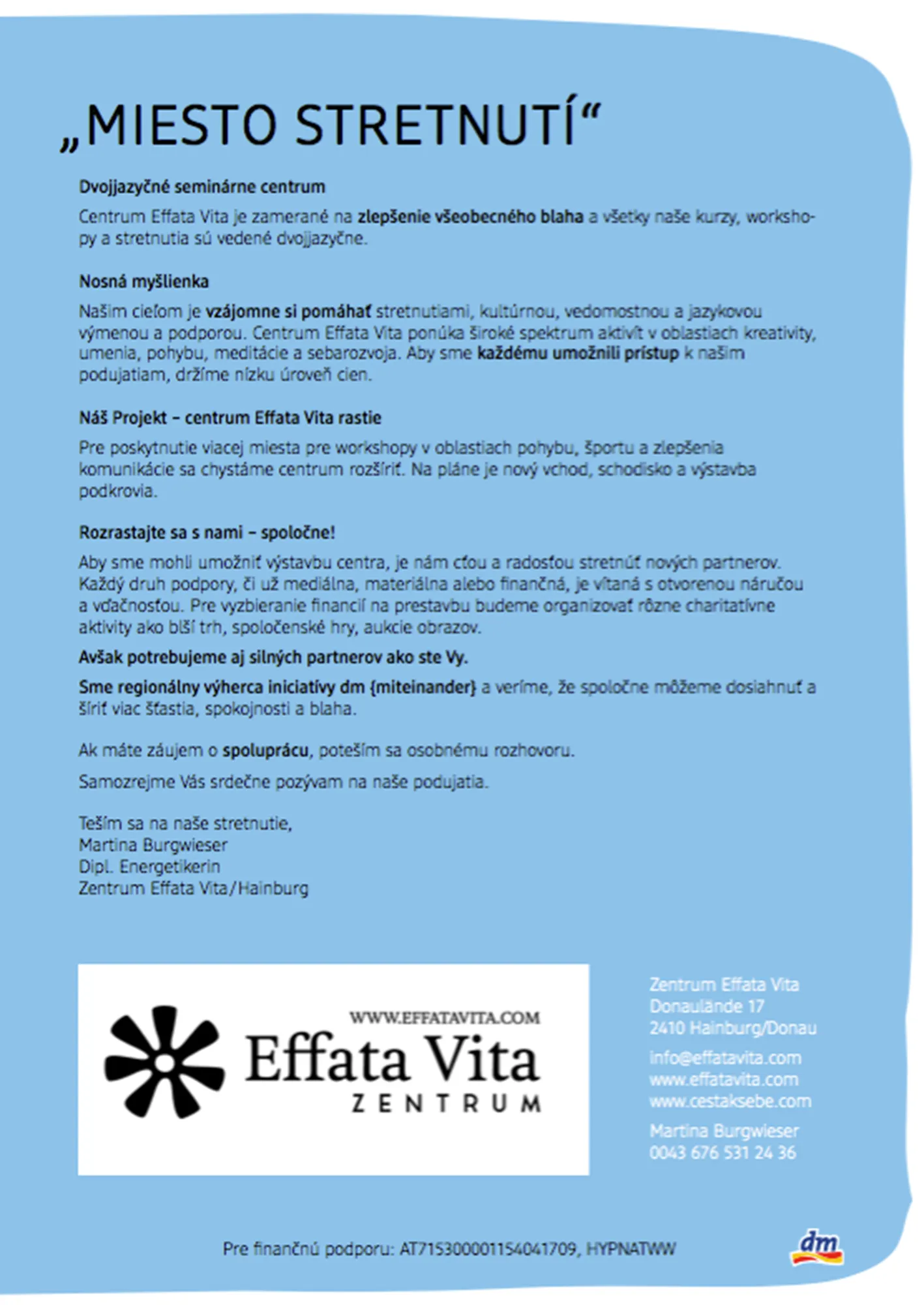 Das Zentrum Effata Vita in Bruck a. d. Leitha bietet sämtliche Kurse und Workshops aus den Bereichen Bewegung, Meditation, Kreativität und Spiritualität zweisprachig an. Von dem Kulturaustausch, der dabei entsteht, profitieren Einheimische und slowakische Zuwanderer gleichermaßen. Grund genug für dm drogerie markt, die benötigten Werbemittel dem Projekt entsprechend anzupassen.