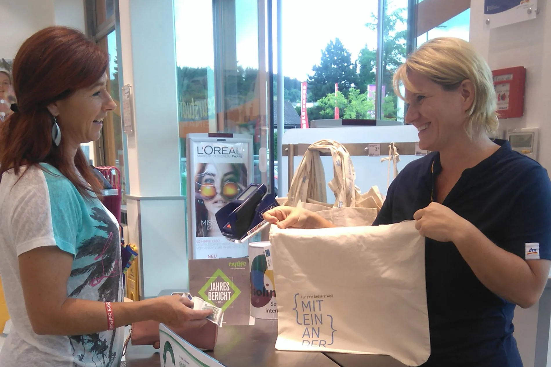 Zusätzlich zu den Sammelboxen können Kunden in den teilnehmenden Filialen eine {miteinander}-Tasche erstehen – pro verkaufter Baumwolltasche geht ein Euro direkt an das Projekt SOLINA.