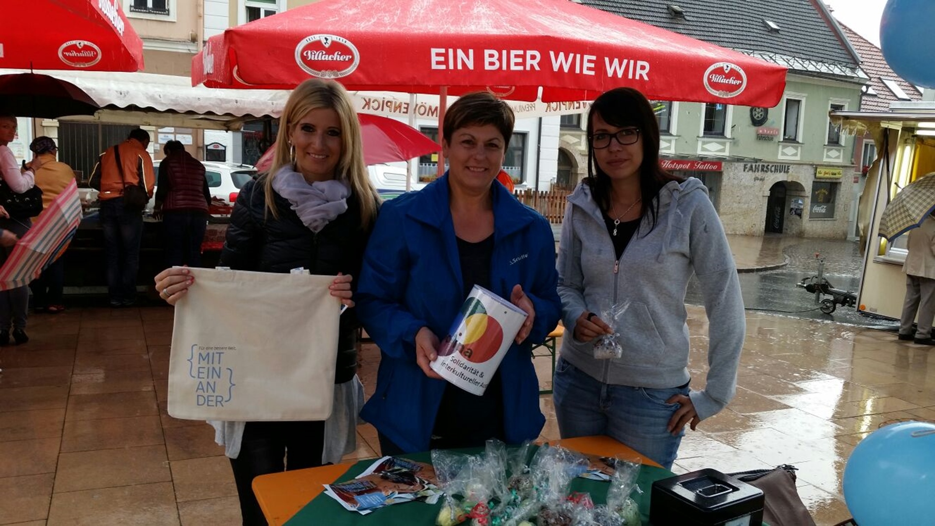 Das SOLINA-Team trotze am 17. September dem Regen und informierte am Feldkirchner Wochenmarkt mit einem eigenen Info-Stand zum {miteinander}-Projekt mit dm drogerie markt. Sozialarbeiterin Corina Wintschnig (am Foto rechts) und dm Mitarbeiterinnen der Filiale Feldkirchen teilten {miteinander}-Taschen gegen einen freiwilligen Geldbetrag an die Besucher aus. "Unsere Besucher waren sehr spendabel!", freut sich Corina Wintschnig von MyLife (SOLINA). Auf einem Plakatständer wurden Fotos von allen Aktionen, die mit SOLINA bereits stattgefunden haben, abgebildet.