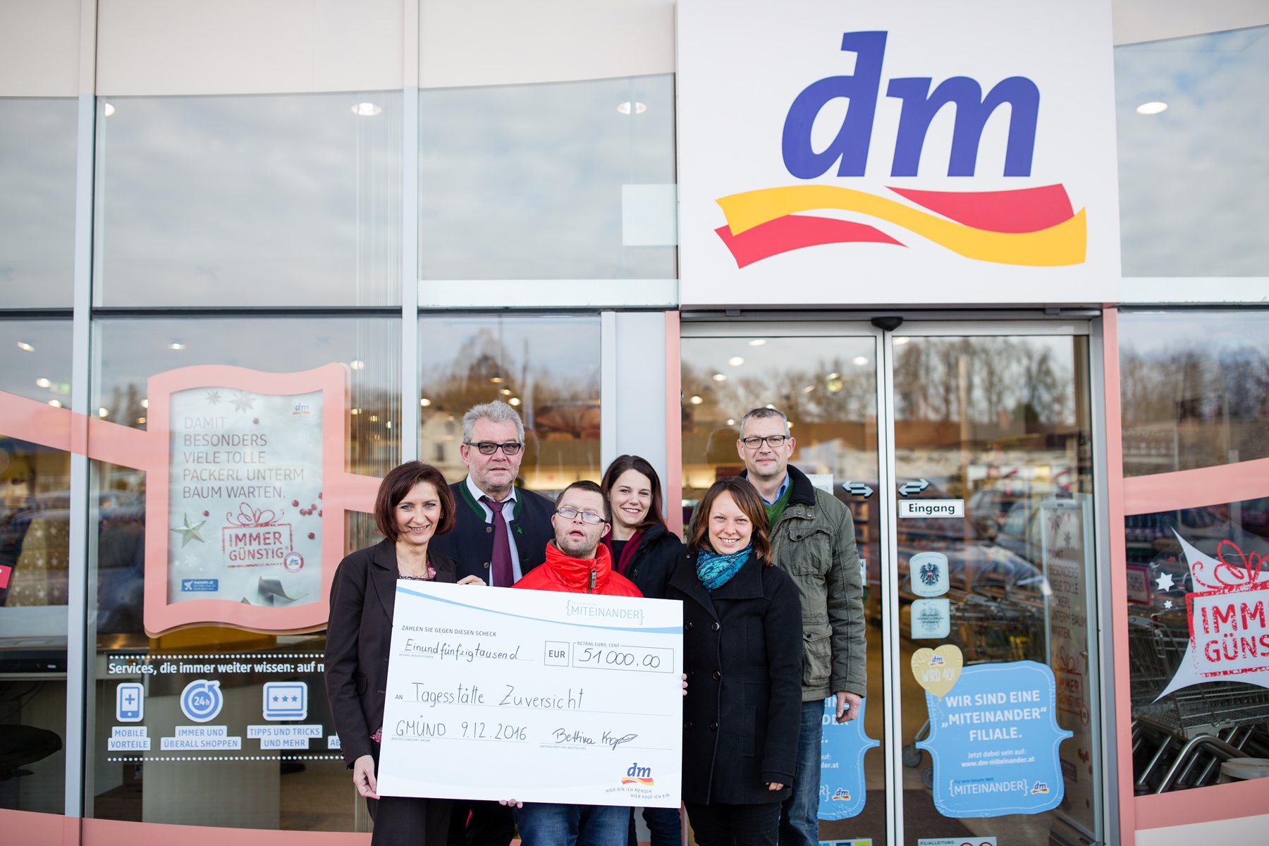 Sieben niederösterreichische dm Filialen haben seit Mai Gelder gesammelt, damit die Tagesstätte Zuversicht, die Menschen mit Handicap beschäftigt und seit geraumer Zeit mit Platzproblemen kämpft, endlich ausgebaut werden kann. Direkt vor und in den teilnehmenden Filialen fanden Märkte statt, wo dm Mitarbeiter gemeinsam mit den Mitarbeitern der Tagesstätte handwerkliche Schätze wie Wachskerzen, Windlichter und Holzdekorationen verkauften.