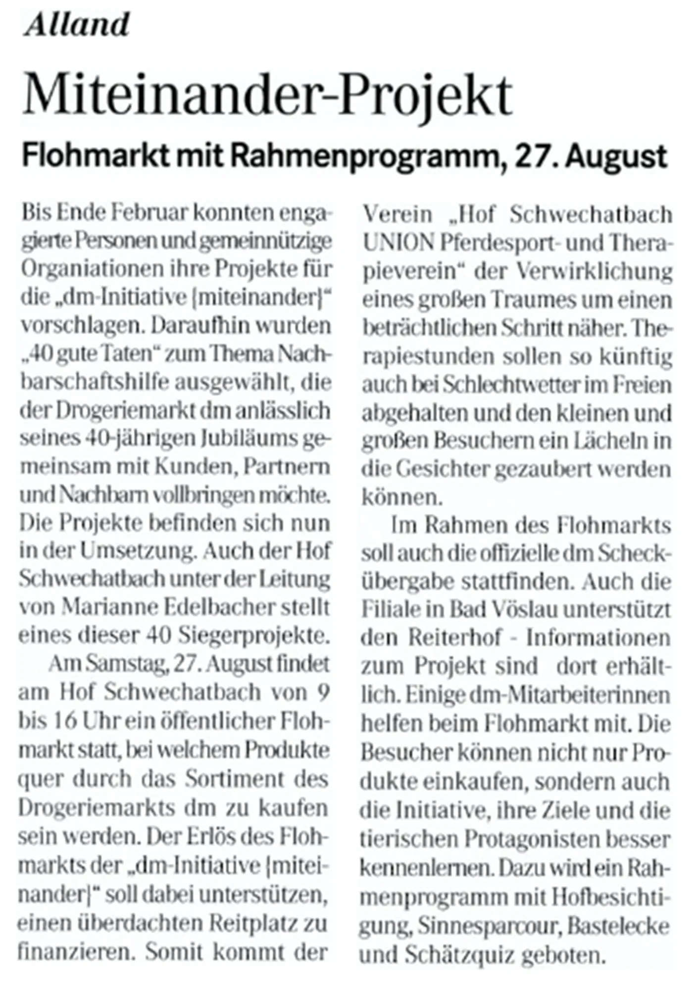 Die Vorfreude ist groß, denn in wenigen Tagen ist einiges los am Hof Schwechatbach in Alland. Es wird ein Flohmarkt in Zusammenarbeit mit dm drogerie markt veranstaltet, um finanzielle Mittel für die Überdachung des Außenbereiches zu sammeln.